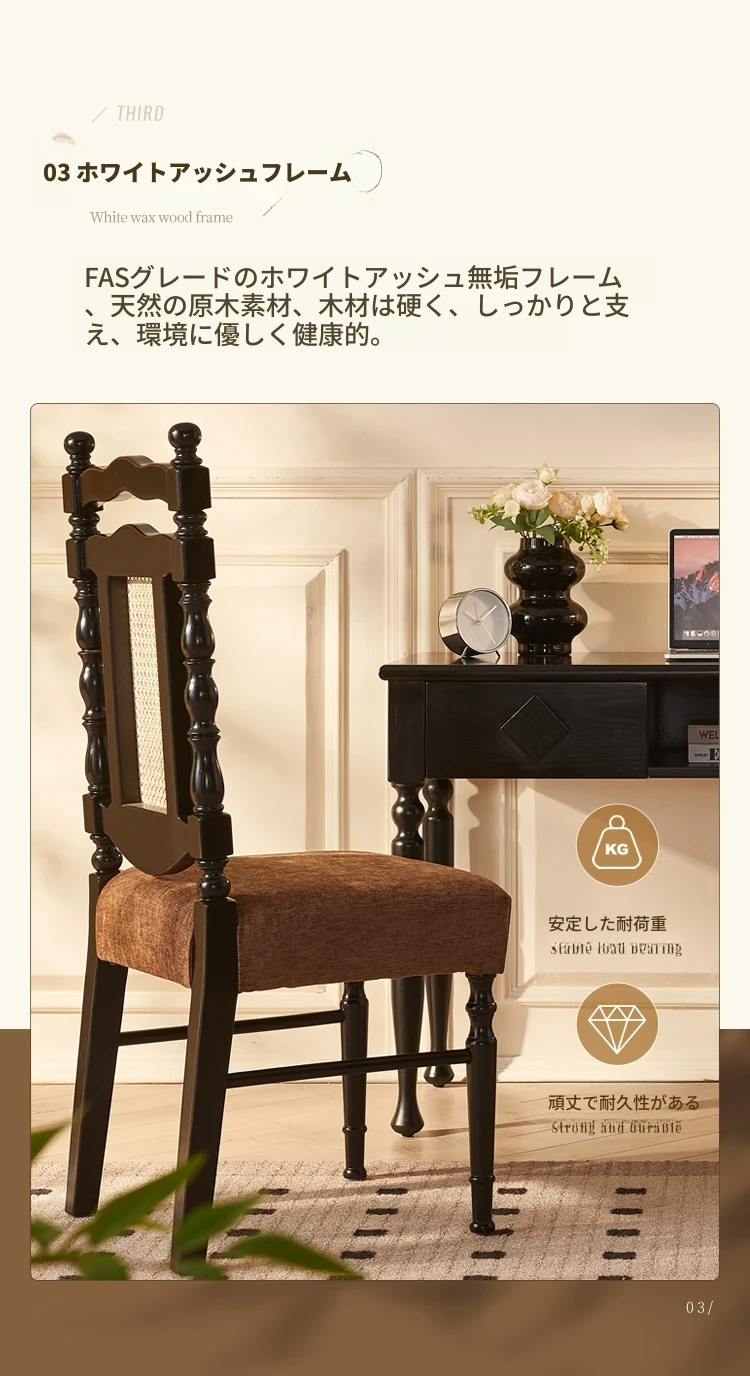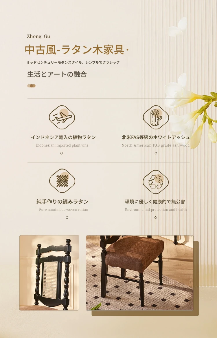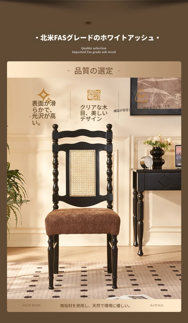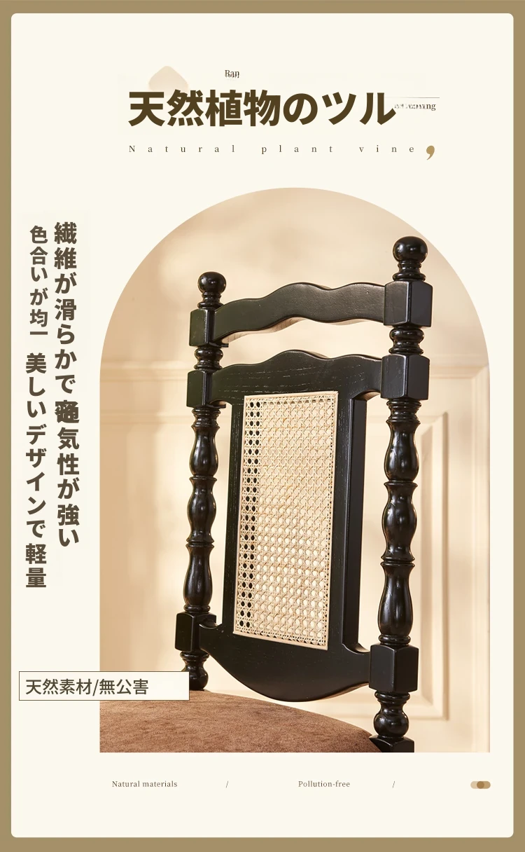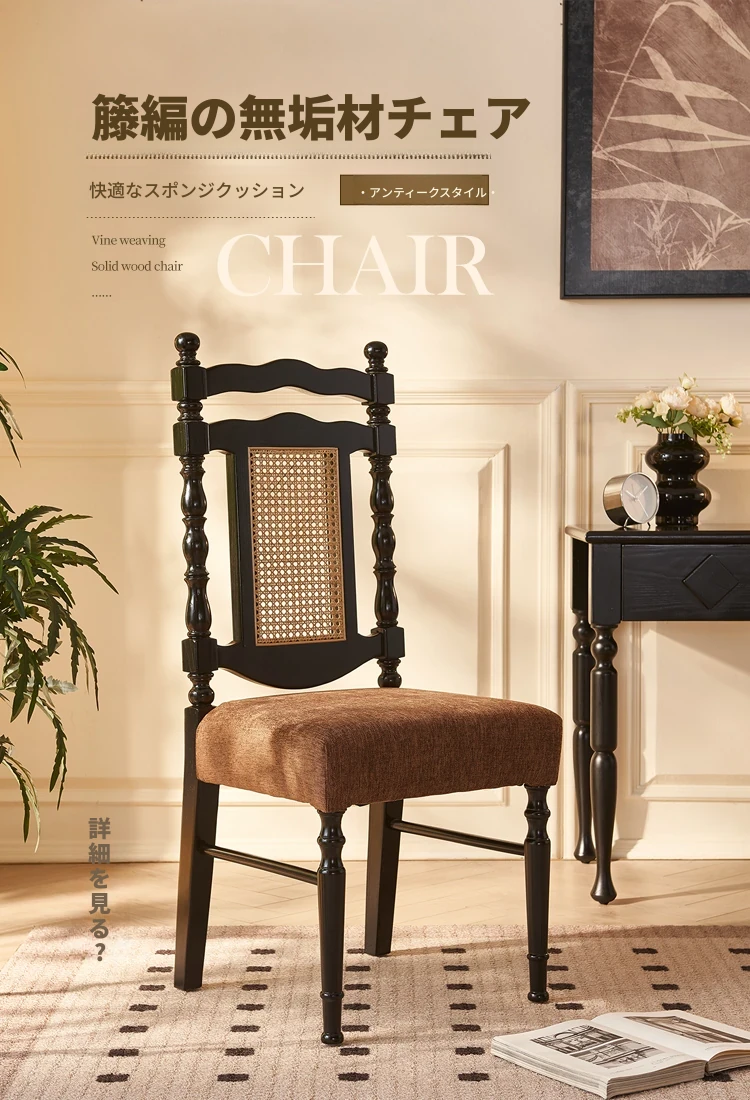 フレンチヴィンテージスタイルの無垢材ラタン編み背もたれダイニングチェア、小さなスペースに最適な民宿やカフェ、レストラン、家庭用の寝室ドレッシングチェアとしても活躍!おしゃれで快適な座り心地をお楽しみください。
