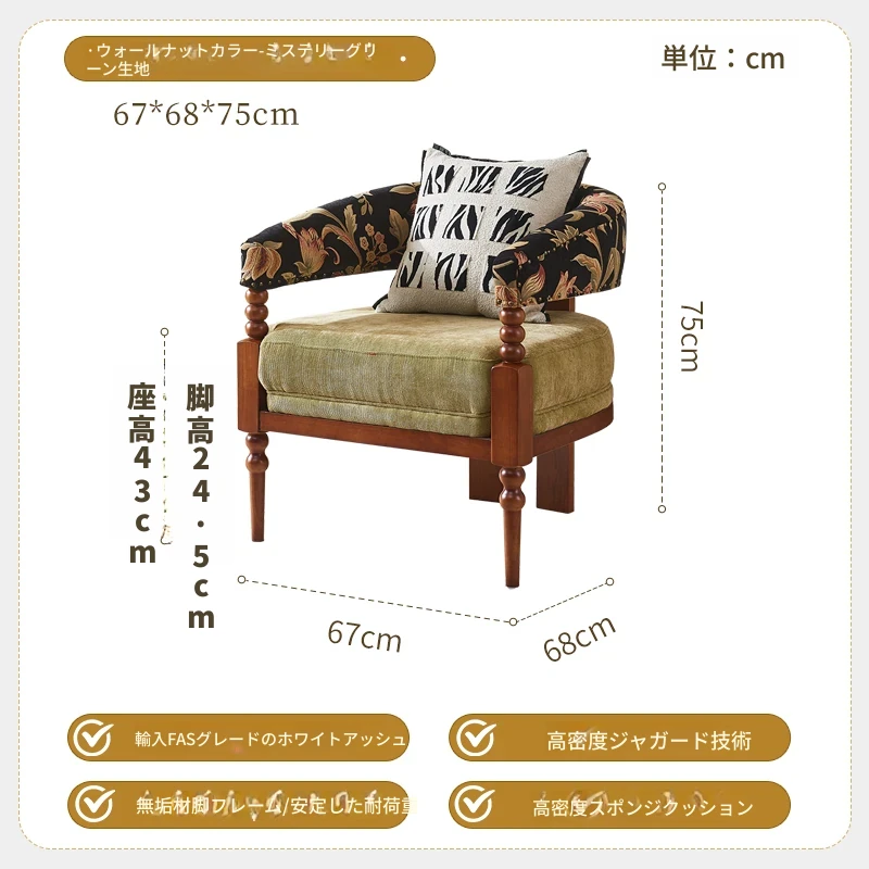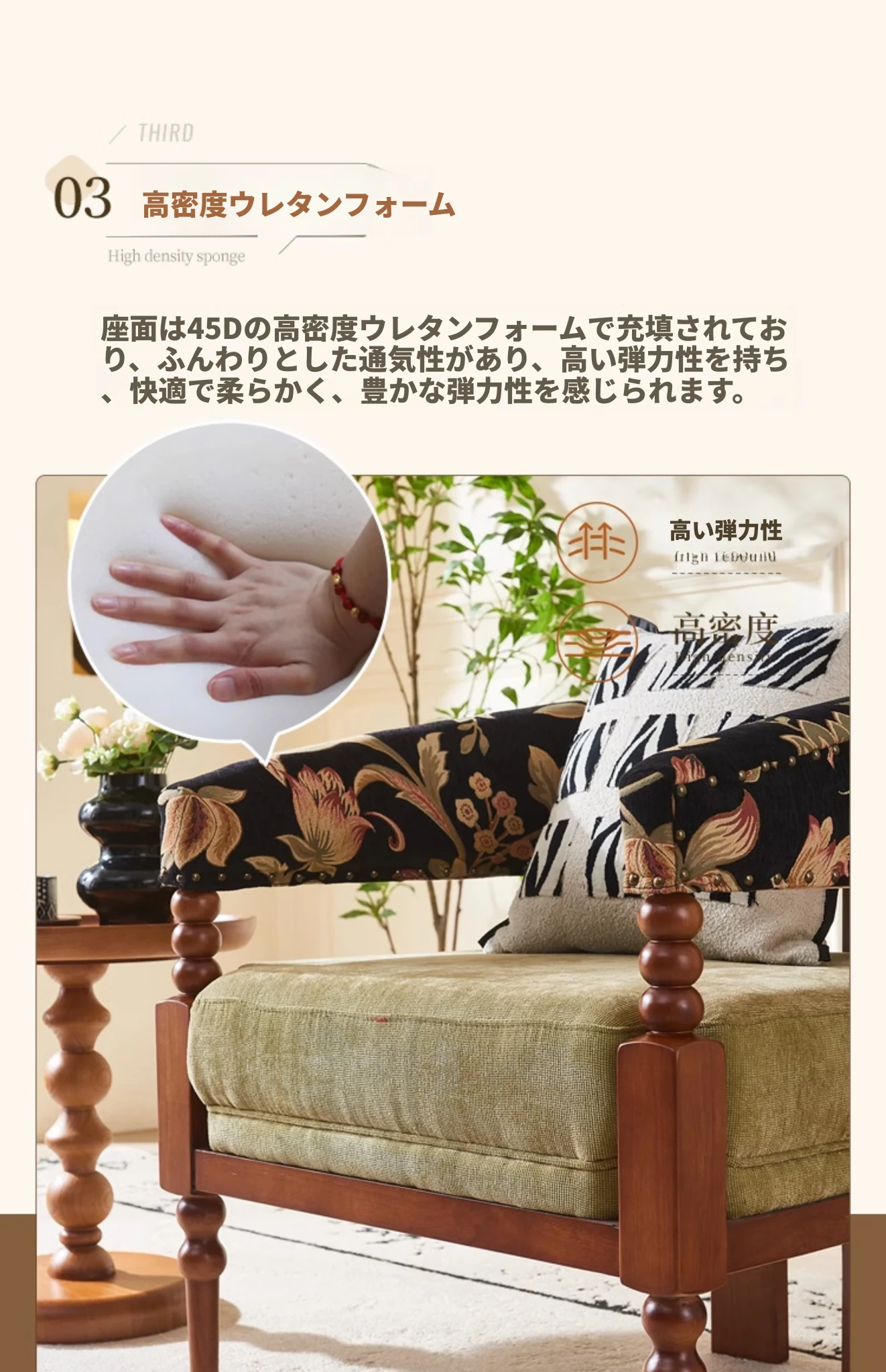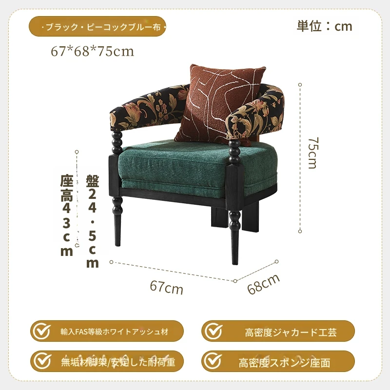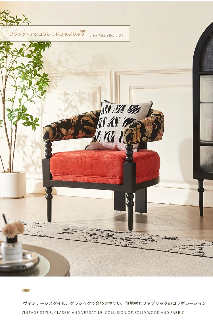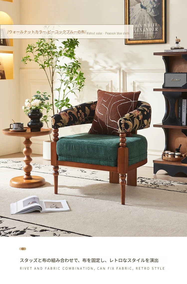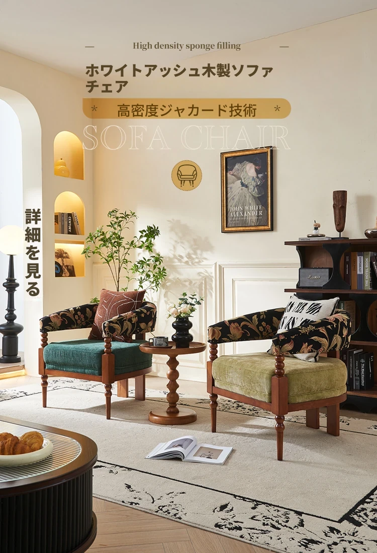 フレンチヴィンテージ無垢材シングルソファチェア - リビングやバルコニーに最適なリラックスチェア!ミニマルデザインの小型住宅向け、洗練されたデザイナー作品。