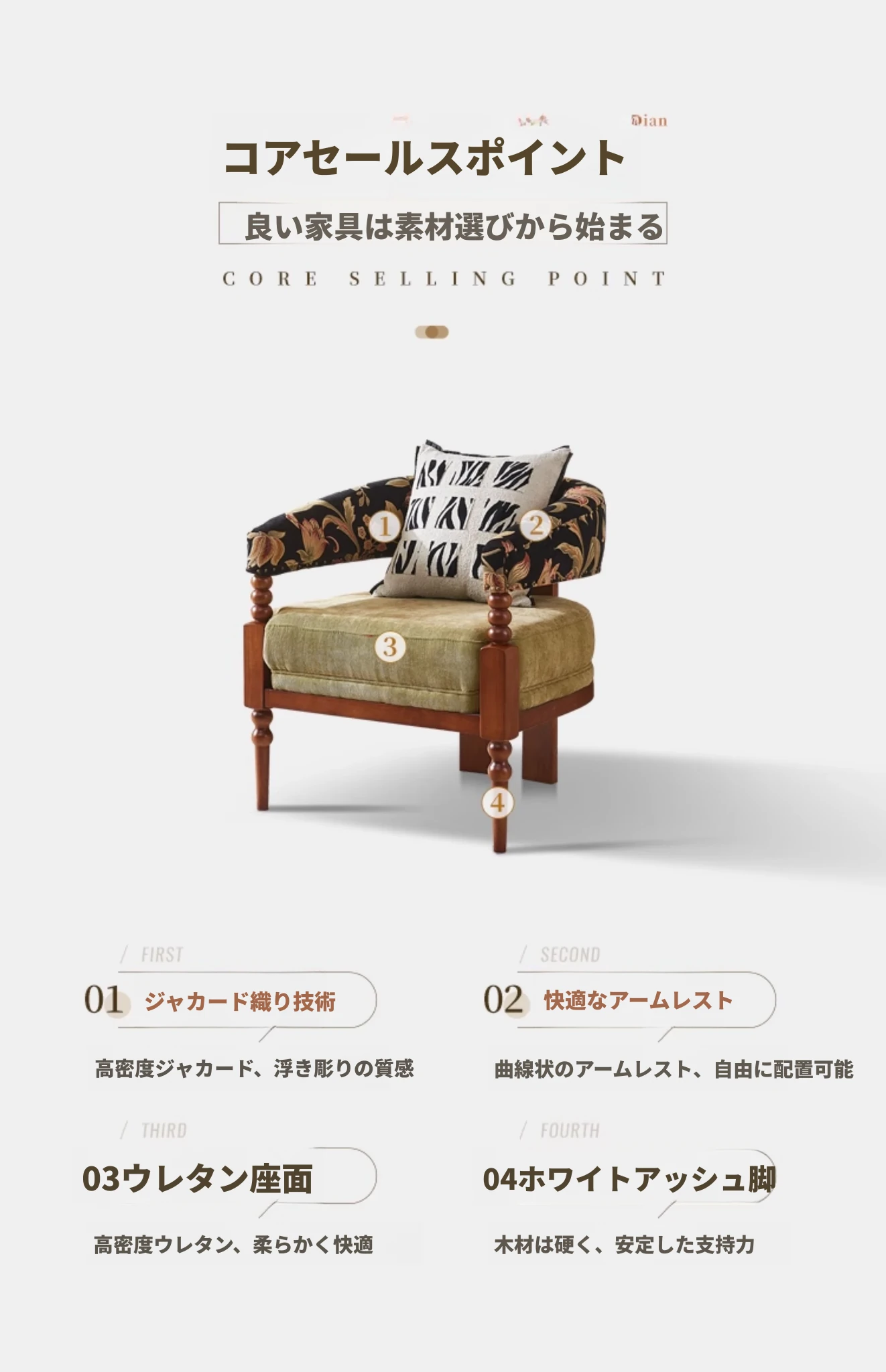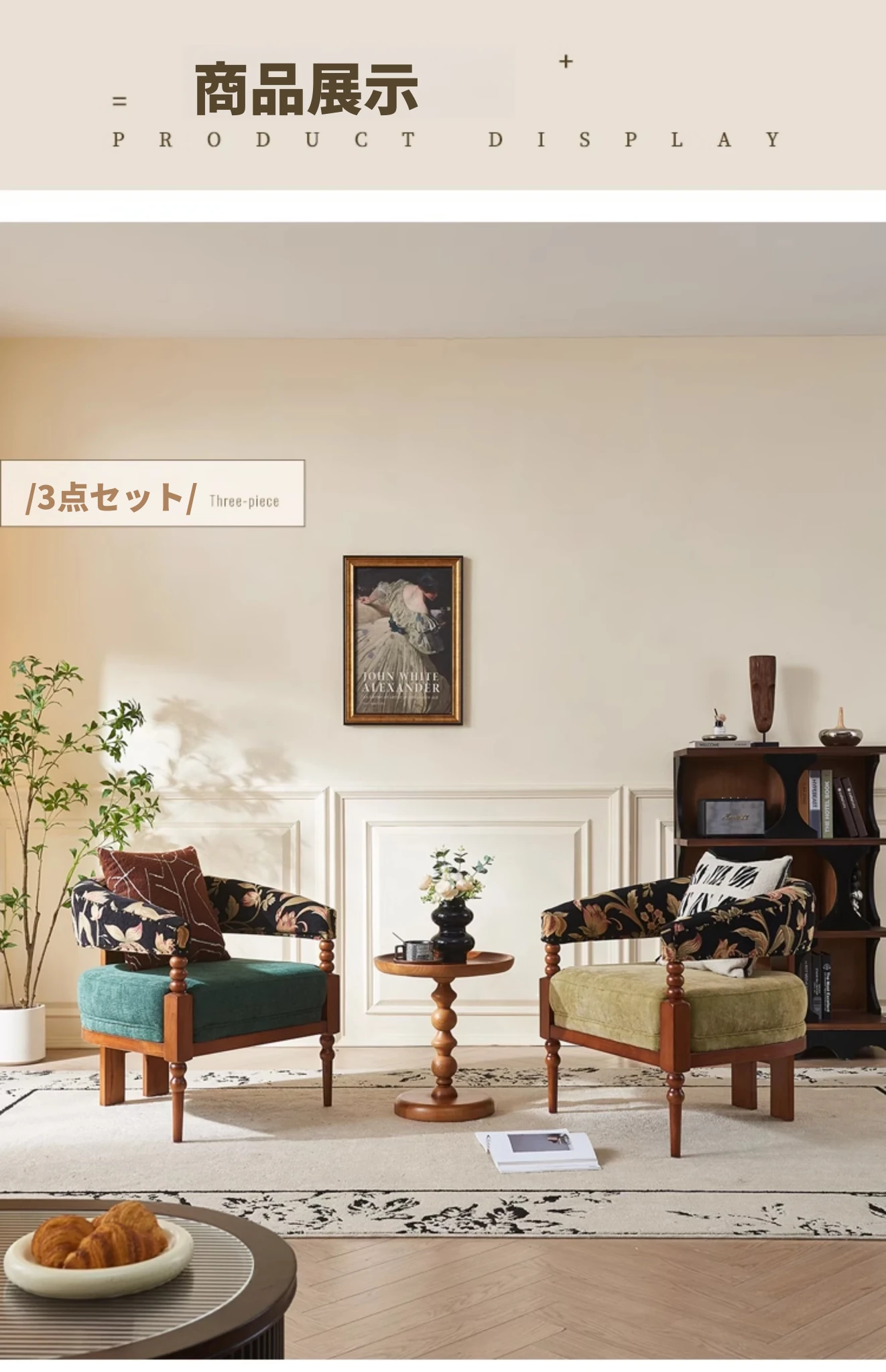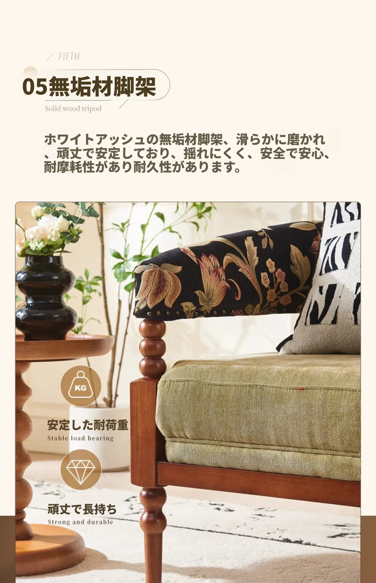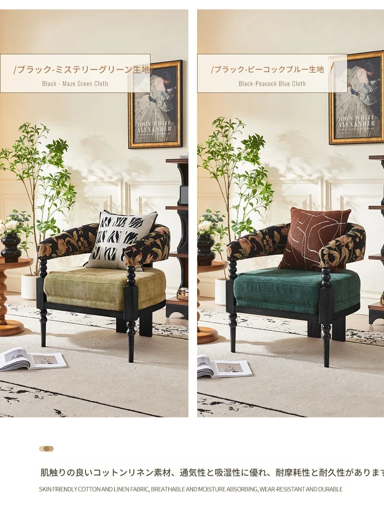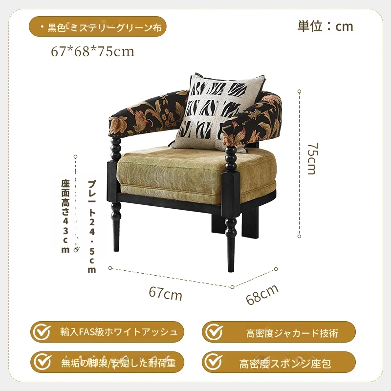 フレンチヴィンテージ無垢材シングルソファチェア - リビングやバルコニーに最適なリラックスチェア!ミニマルデザインの小型住宅向け、洗練されたデザイナー作品。