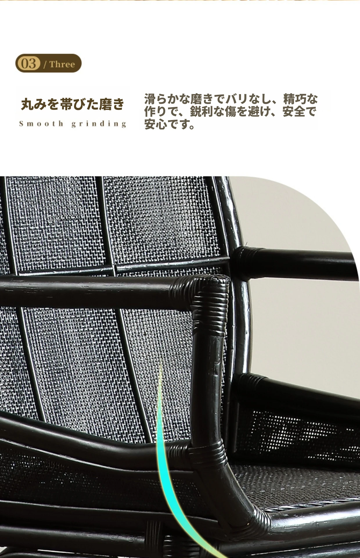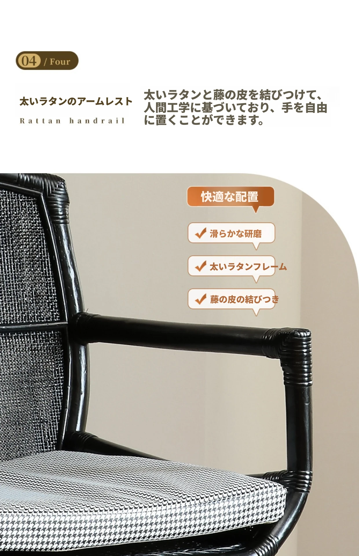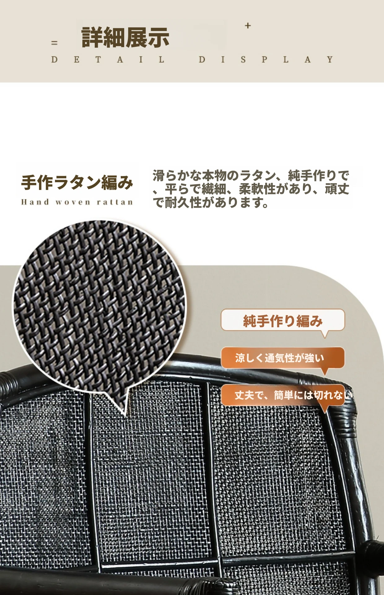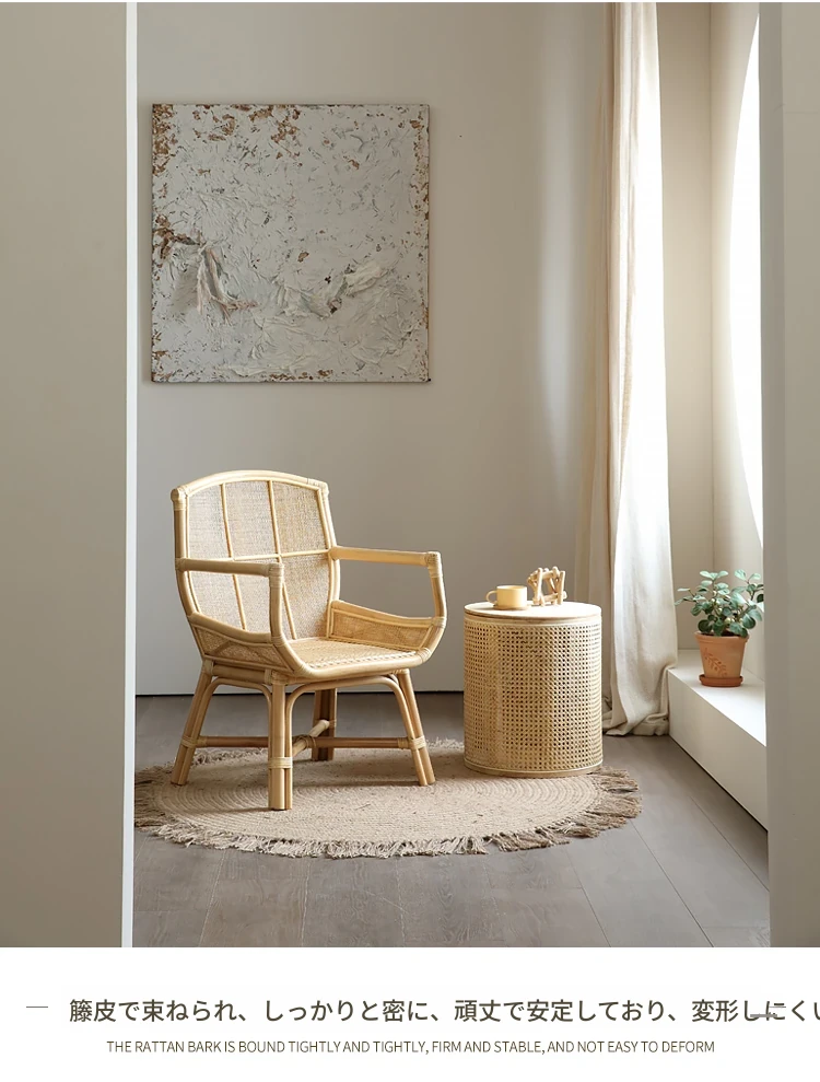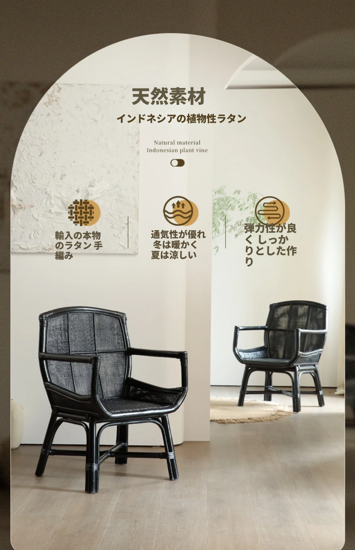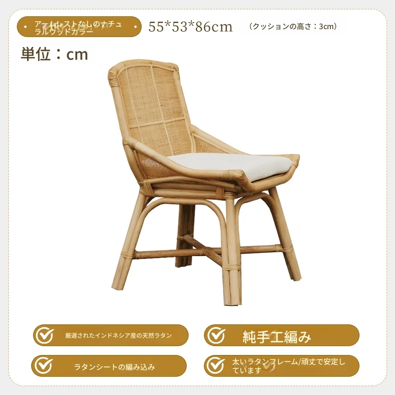 インドネシア製ラタン編みの真藤椅子3点セット - バルコニーでのリラックスに最適な茶卓と椅子のコンビネーション!シンプルで美しい侘寂風デザインの一人用無垢材椅子で、あなただけのくつろぎ空間を演出します。