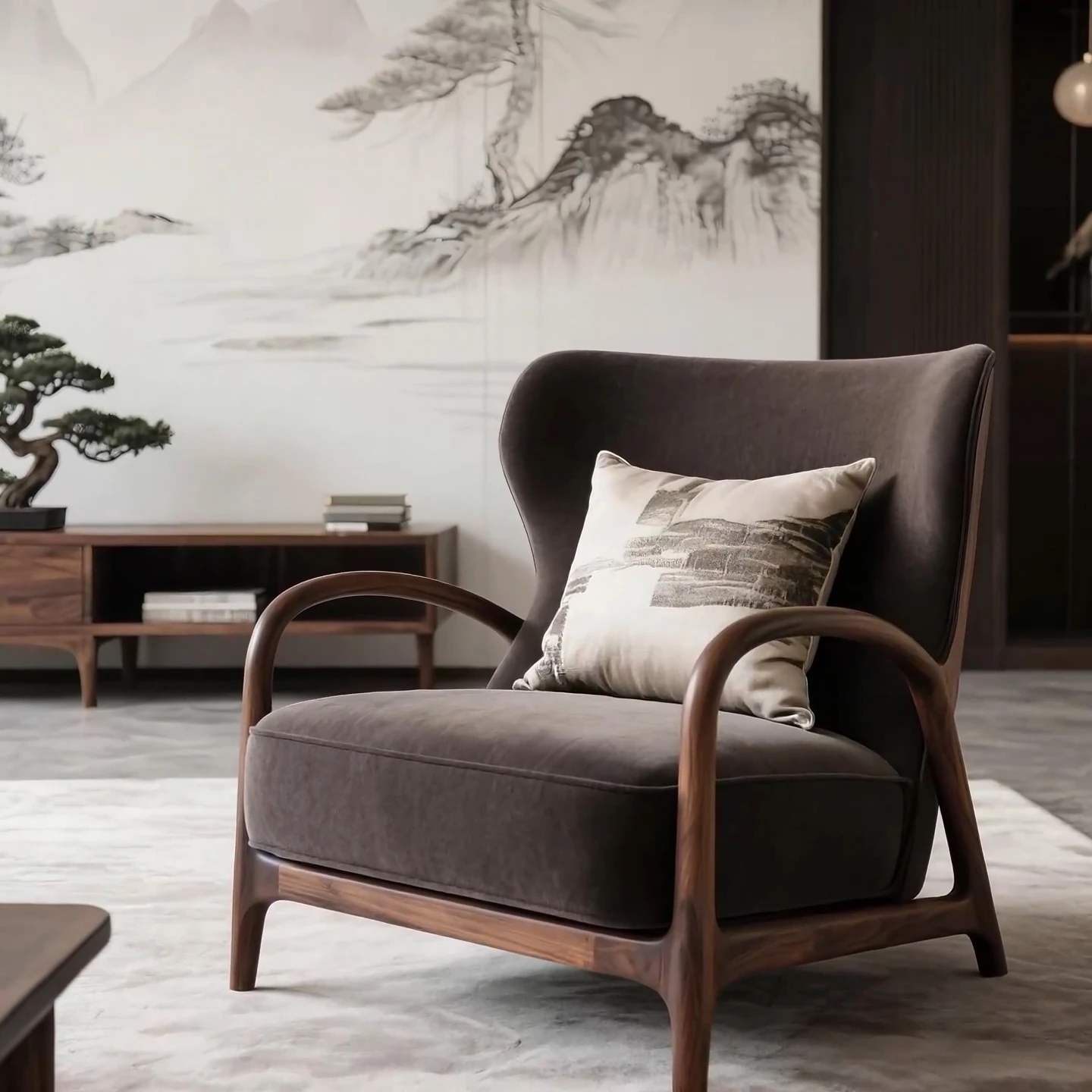 高級感あふれるブラックウォールナット無垢材使用!本革のリラックスチェア—一人掛けソファ。書斎やティールームに最適な背もたれ付きのラウンジチェア。贅沢なひとときをあなたに!