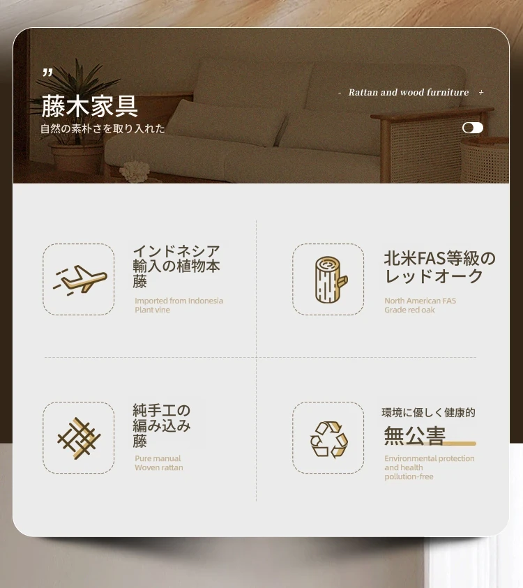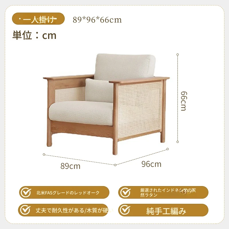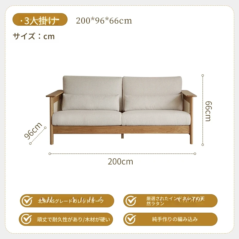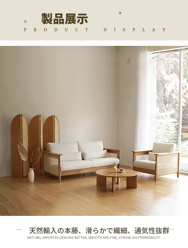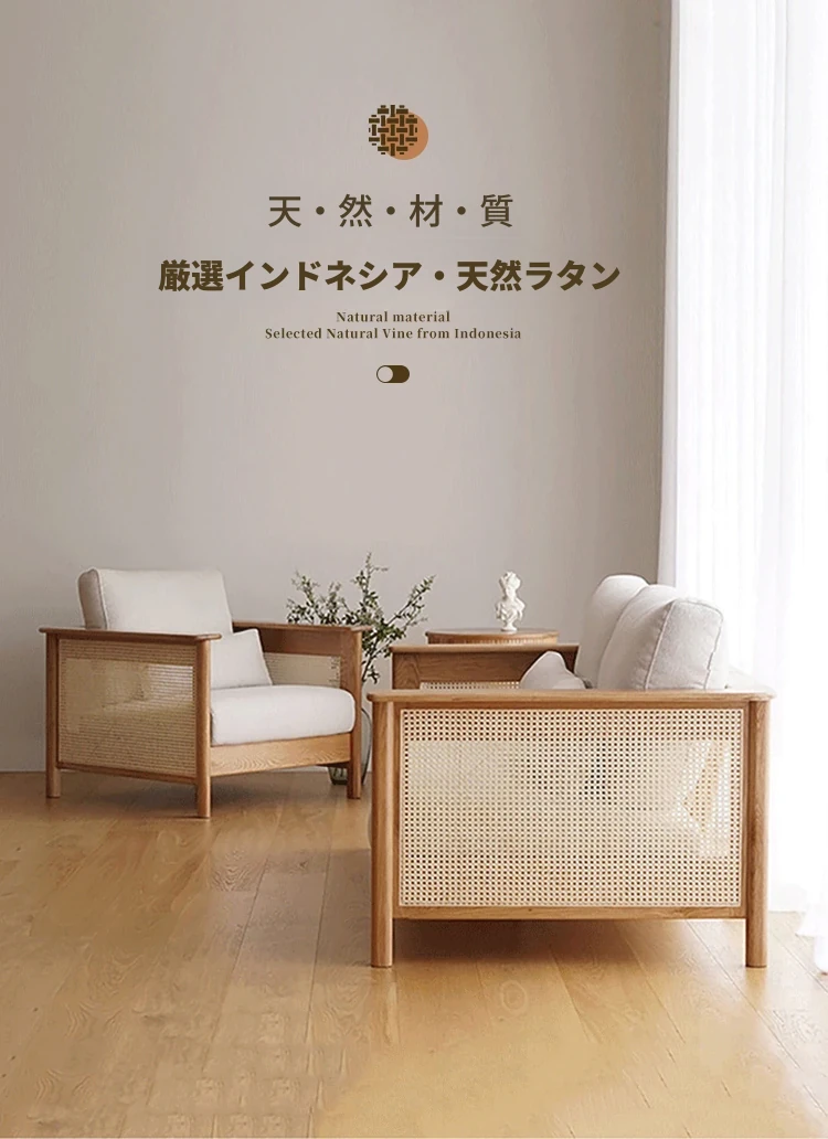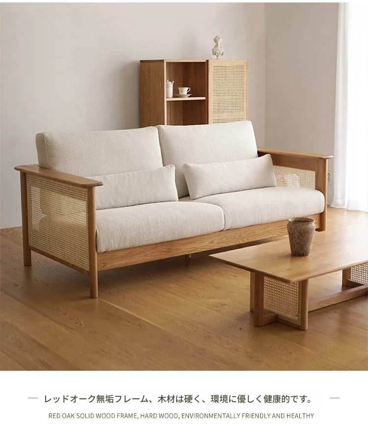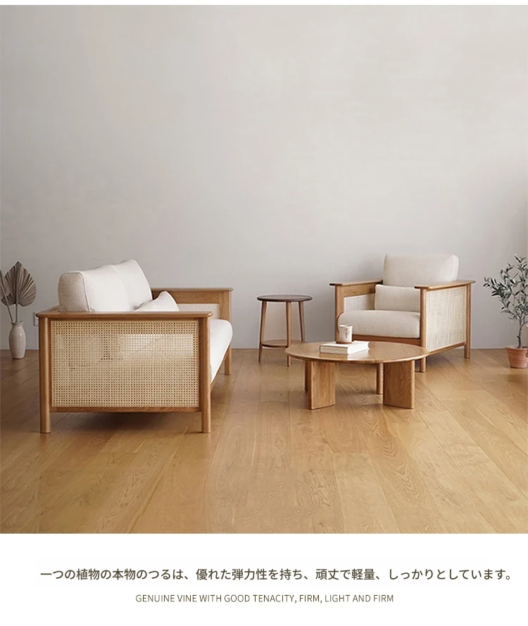 和風リビングにぴったり!天然素材の藤編みソファセット - 小スペースでも映えるモダンデザイン、赤オークの無垢材と布製クッションで快適なひとときを。