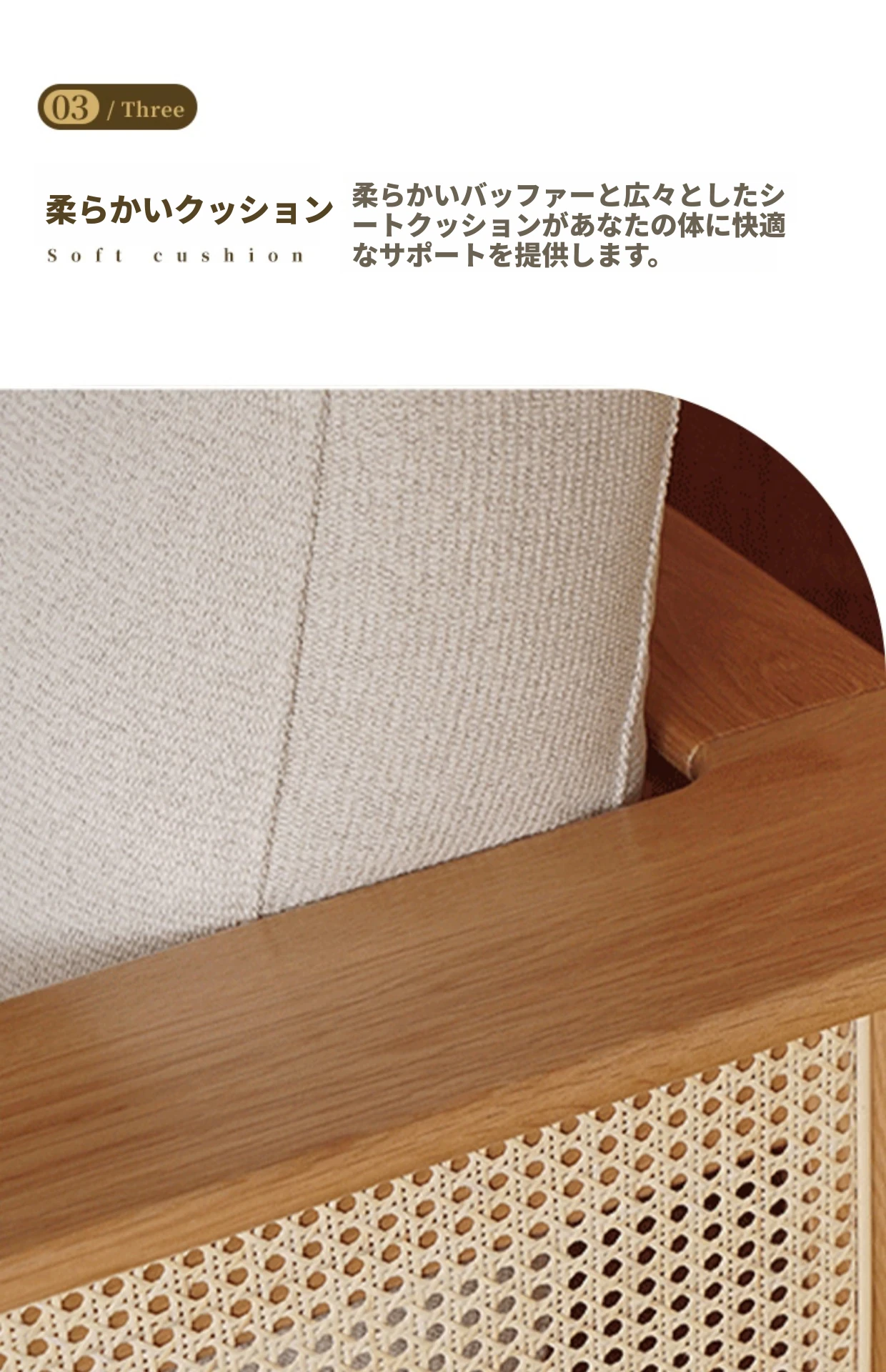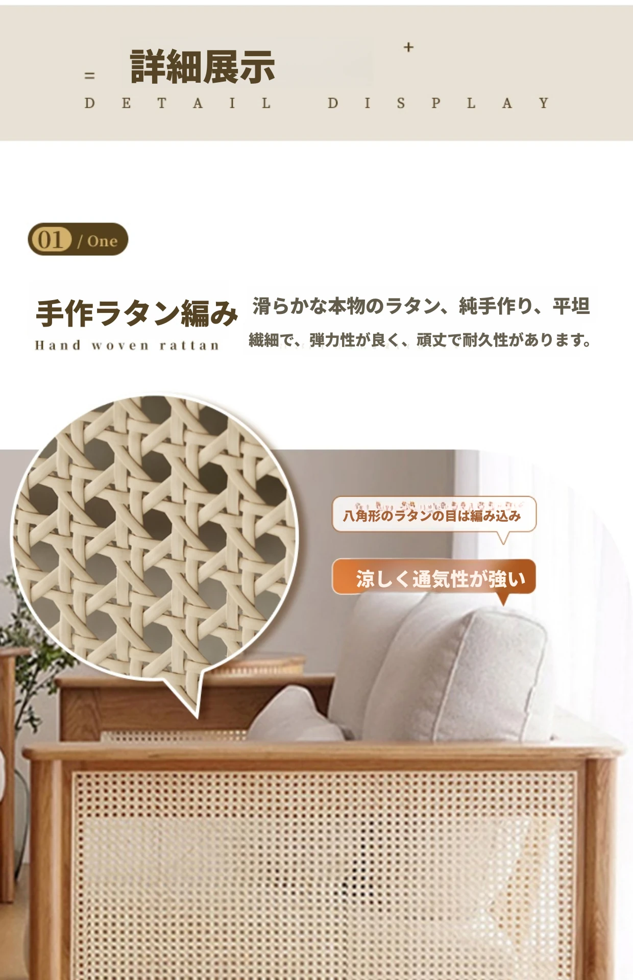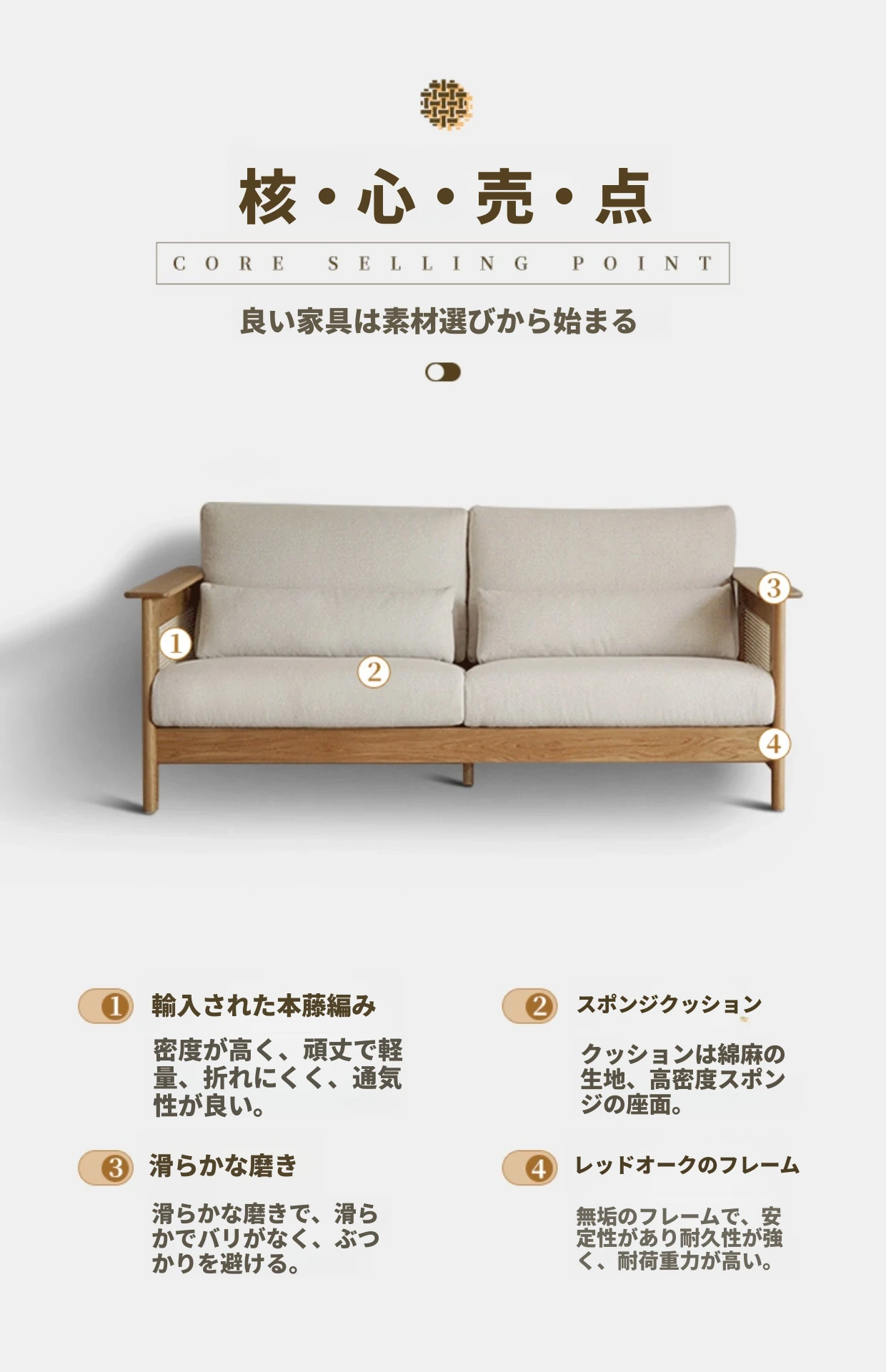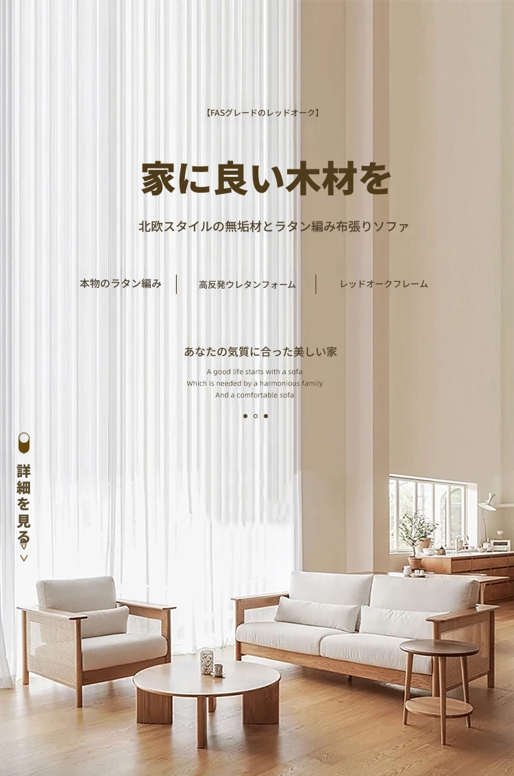 和風リビングにぴったり!天然素材の藤編みソファセット - 小スペースでも映えるモダンデザイン、赤オークの無垢材と布製クッションで快適なひとときを。