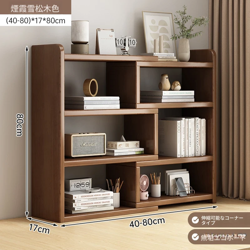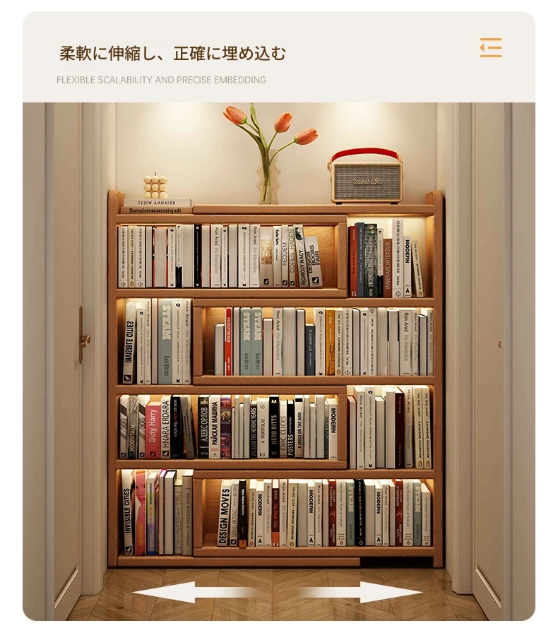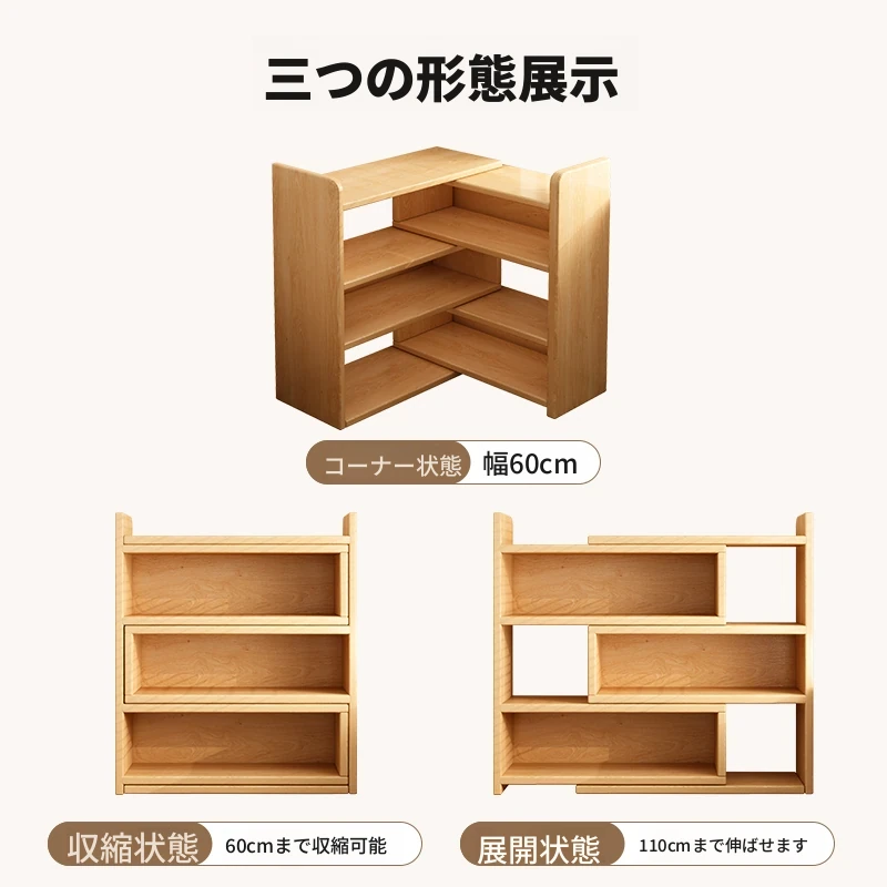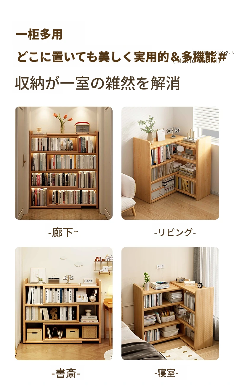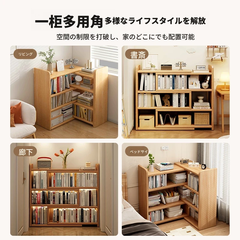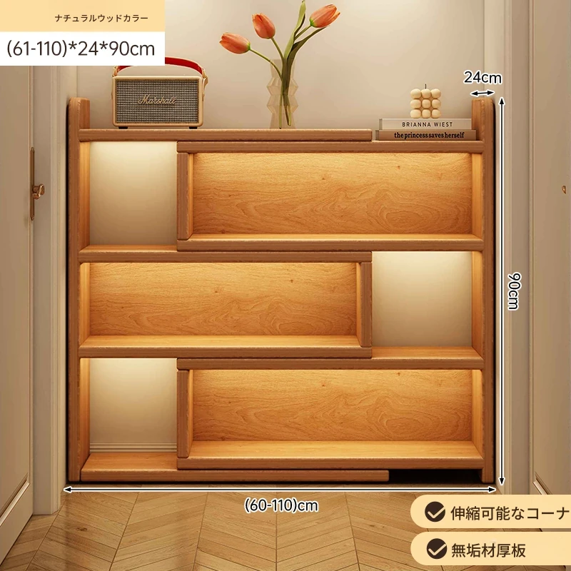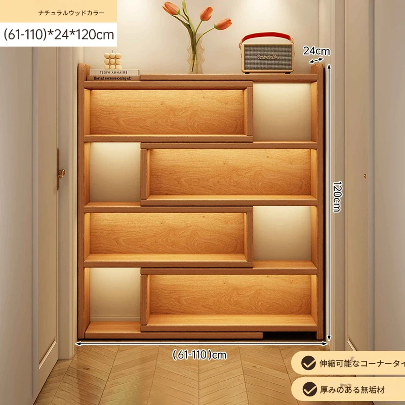 天然木の色合いが美しい!伸縮可能なフロア書棚 - 玄関や学生の部屋に最適な壁掛け収納、角にフィットするデザインで、家の中をスッキリ整頓。用途多彩なオシャレな収納アイテム!