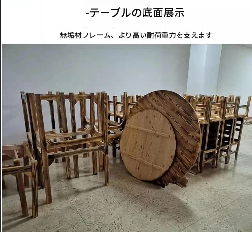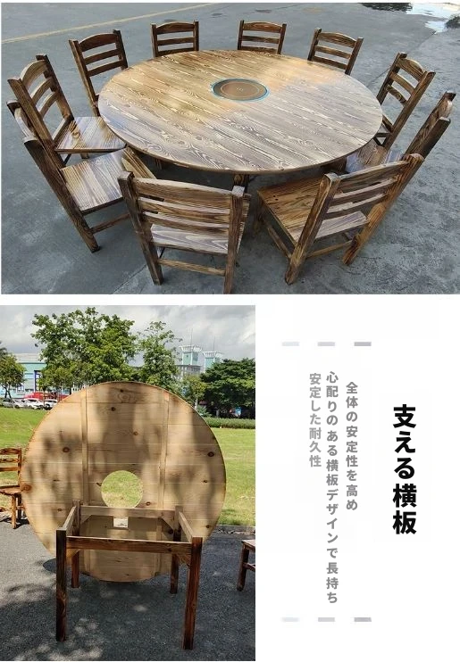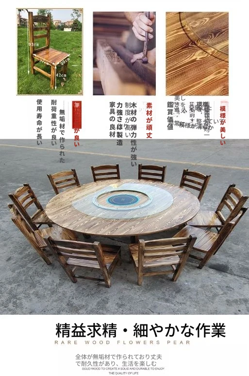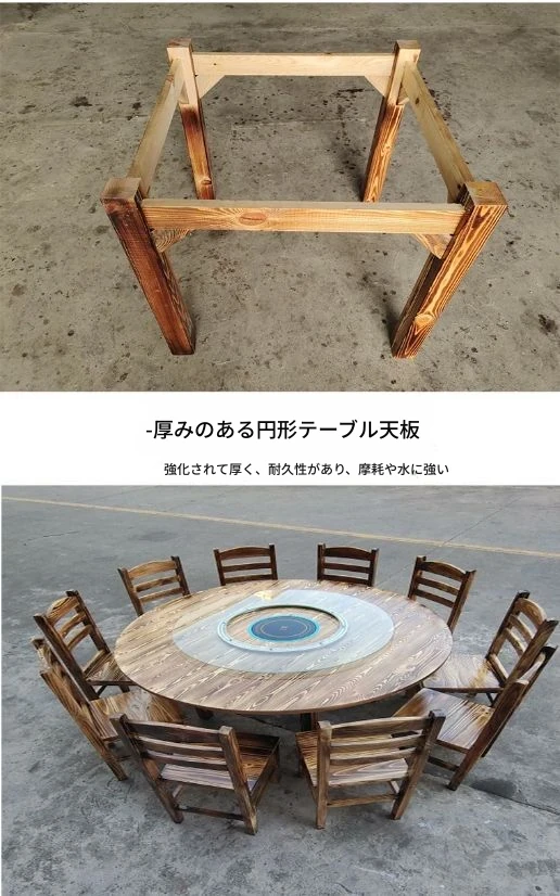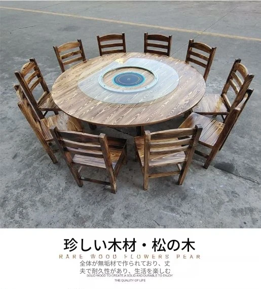 農家レストラン新作!炭化加工のダイニングテーブルセット - 高品質の無垢材使用、火鍋や大人数向けに最適なラウンドテーブルと椅子の組み合わせ。快適な個室も完備!おしゃれで温かみのある空間を演出します。