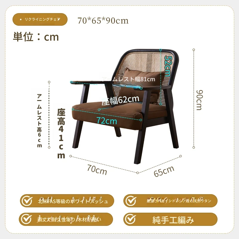 北欧風モダンデザインのラタン編みソファチェア - シンプルでスタイリッシュなリクライニング椅子、リビングやバルコニーに最適。天然木製の一人掛け、ホテルや民宿にもぴったり!