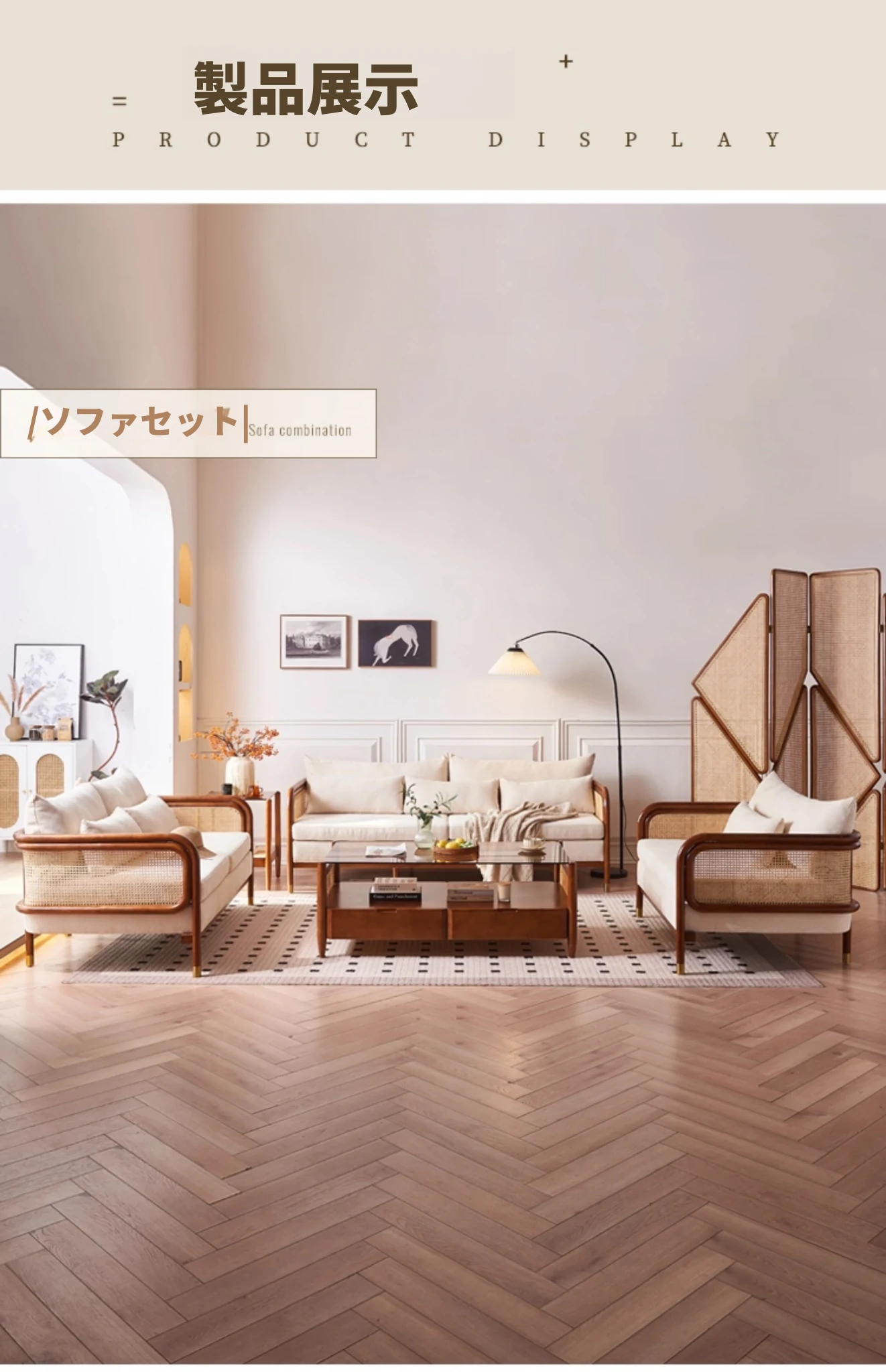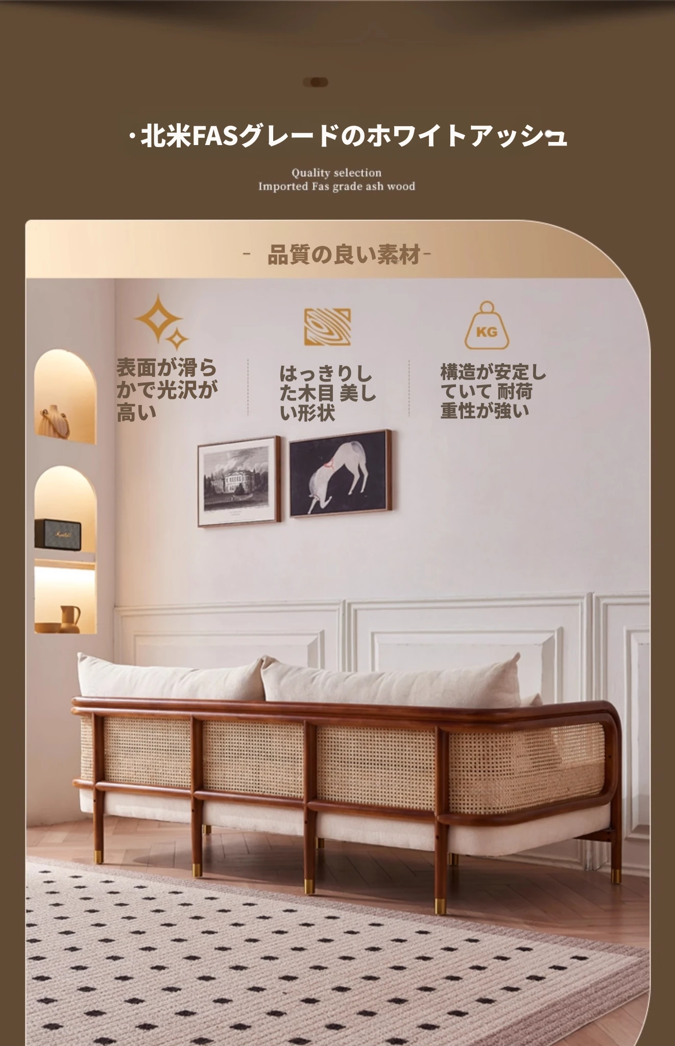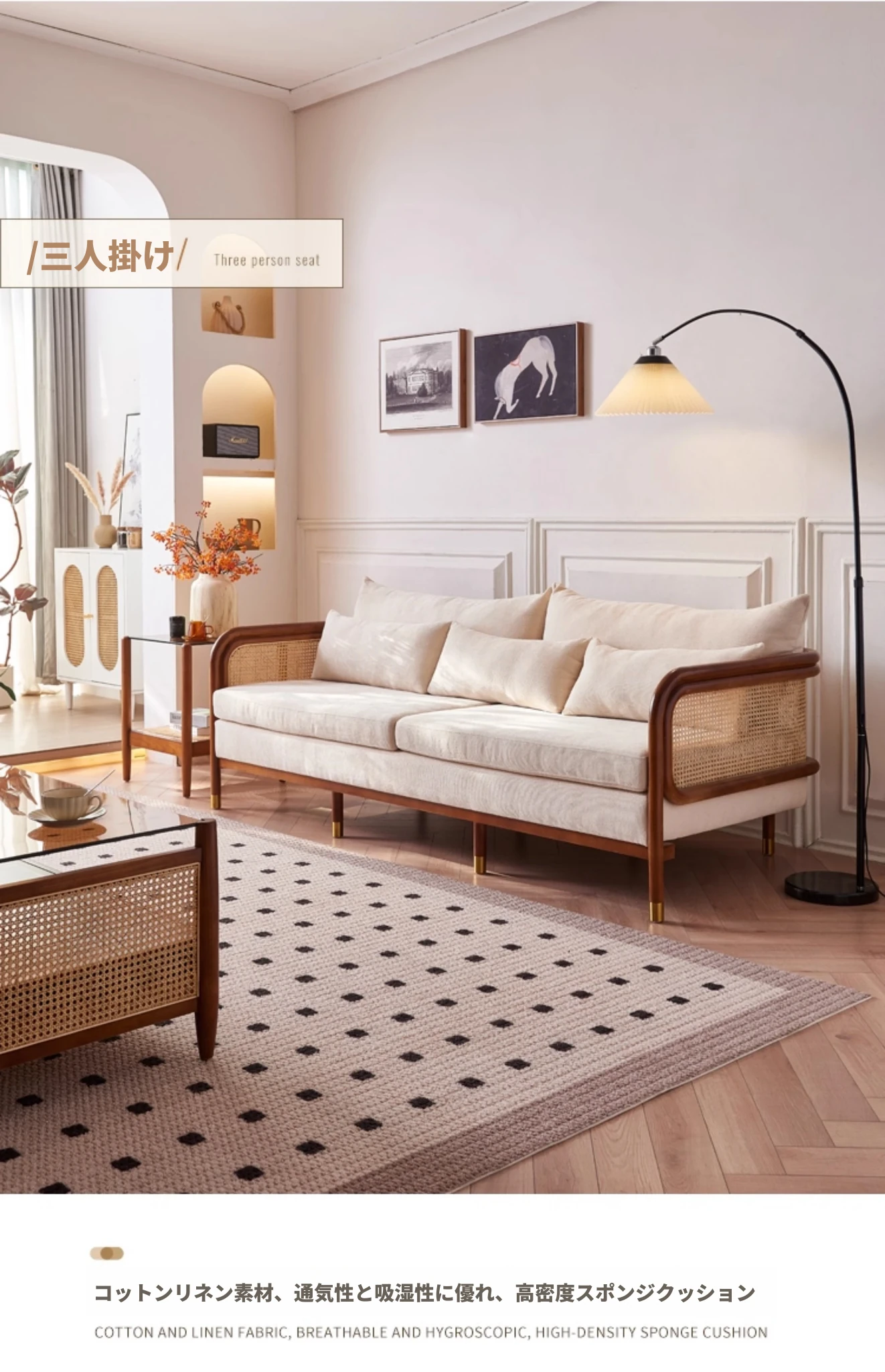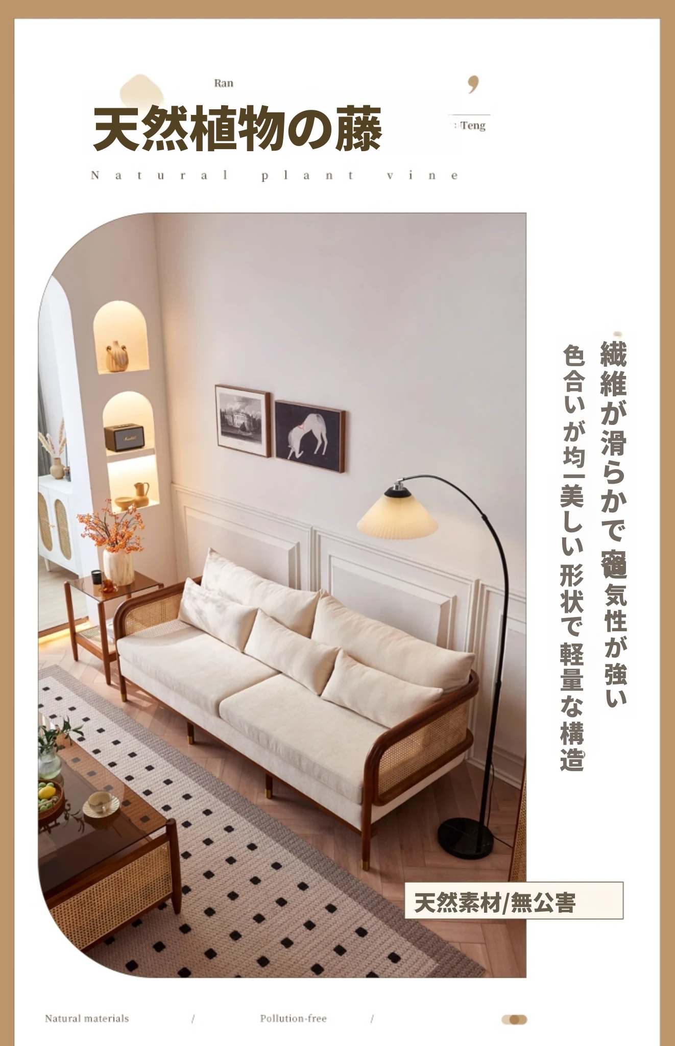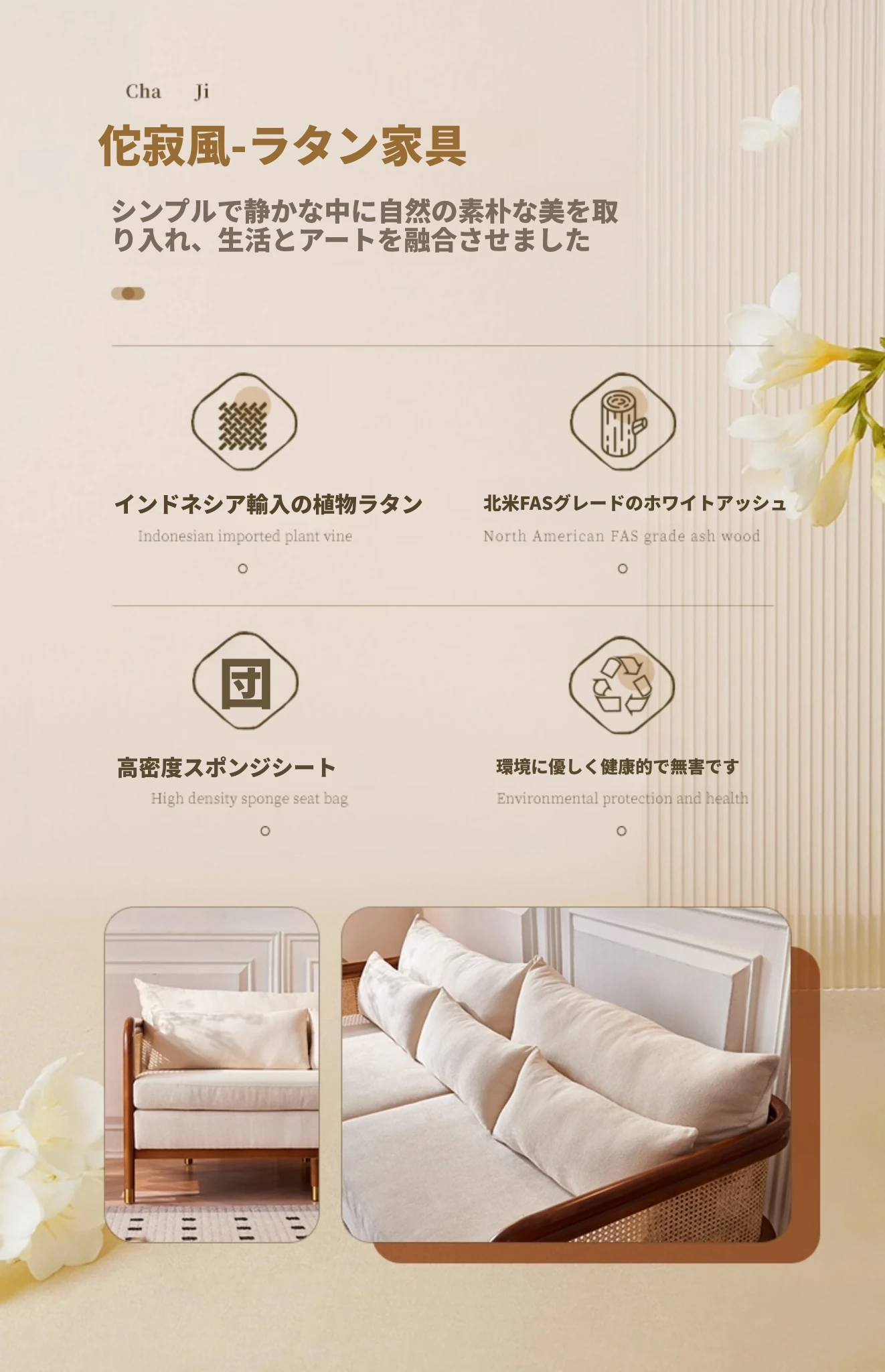 北欧風のラタン編みソファセット - ホワイトアッシュ無垢材の一人用・三人用ラタンチェア、リビングルームにぴったりの家庭用カジュアルファブリックラタンソファ!快適さとスタイルを両立した素敵な空間を演出します。