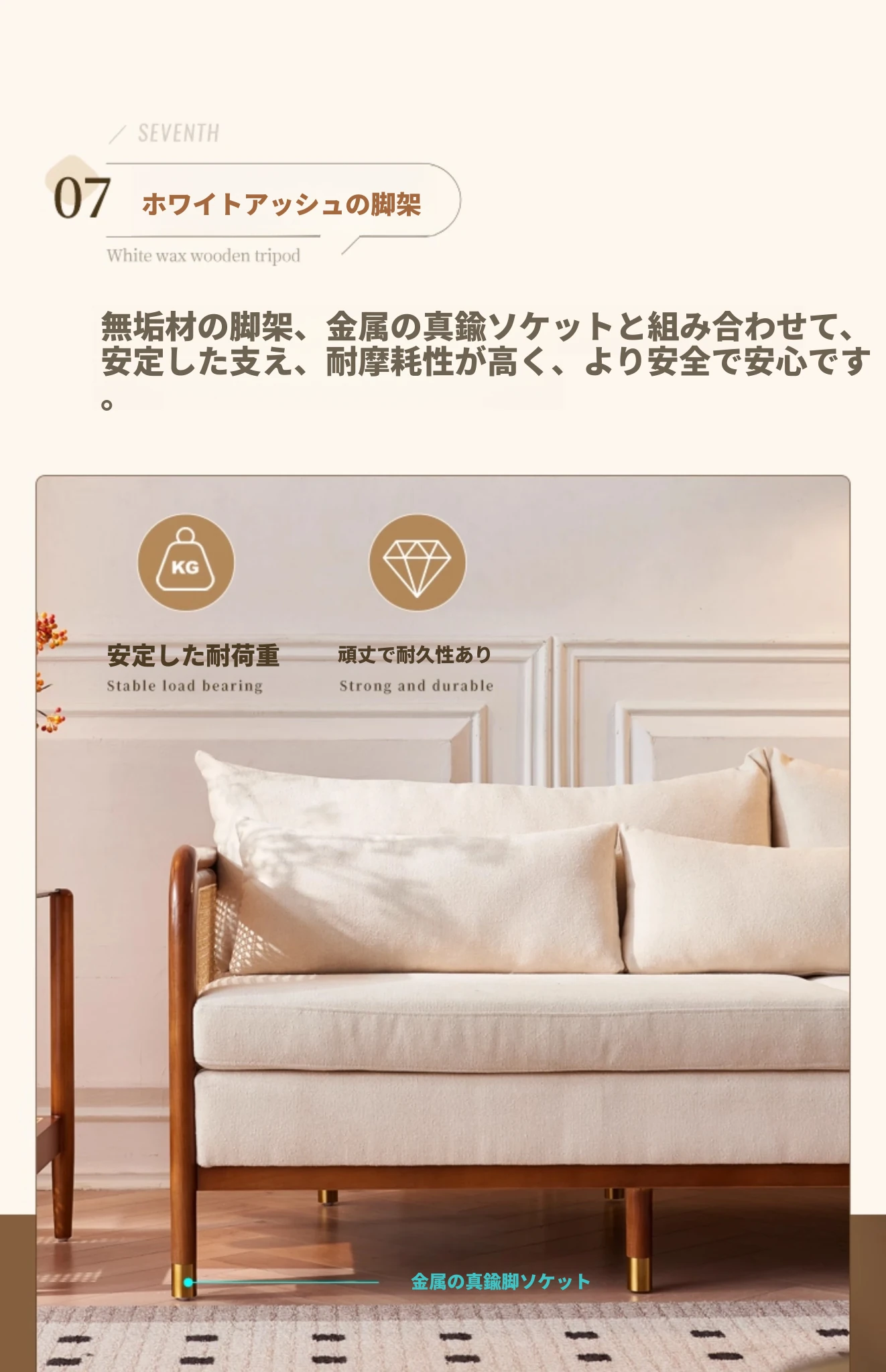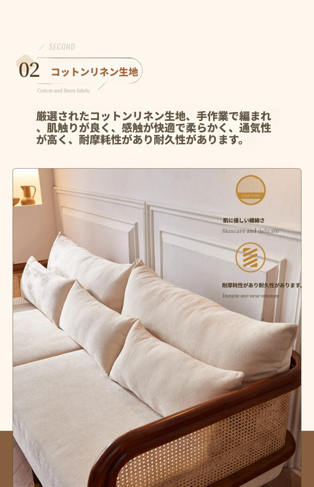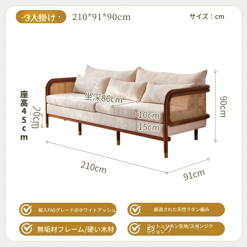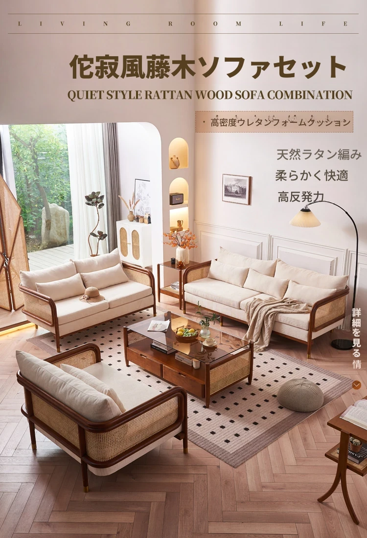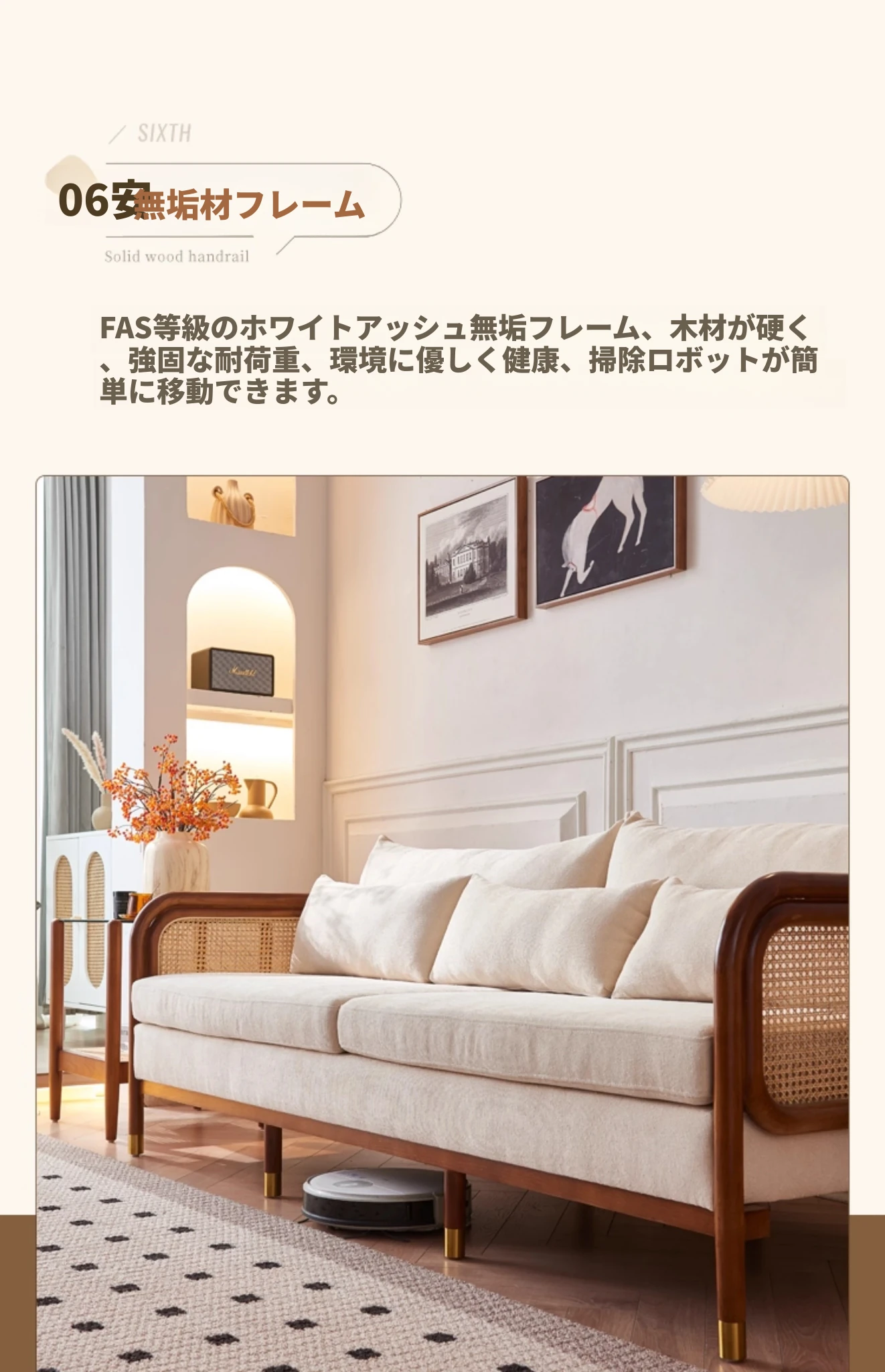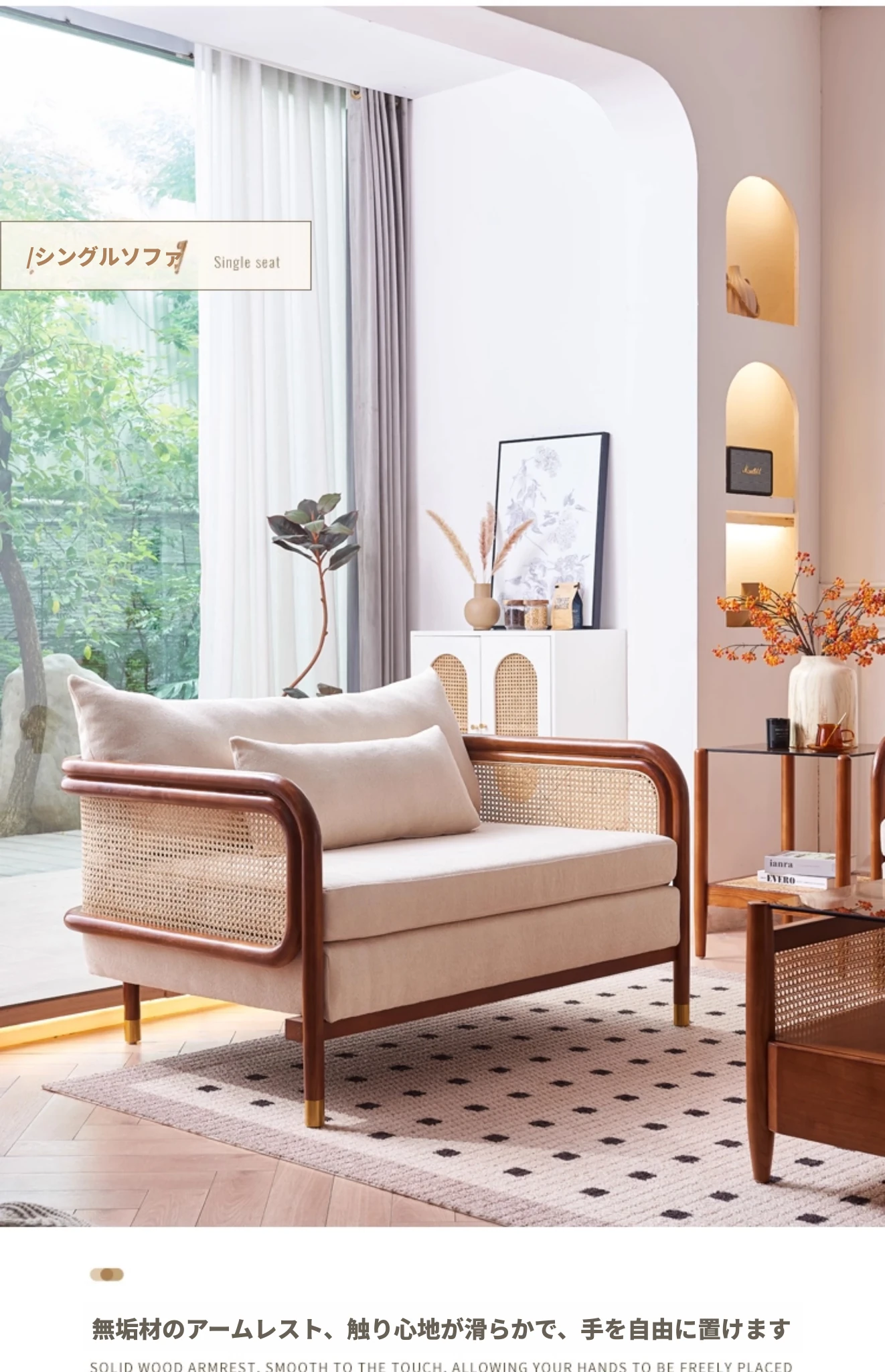 北欧風のラタン編みソファセット - ホワイトアッシュ無垢材の一人用・三人用ラタンチェア、リビングルームにぴったりの家庭用カジュアルファブリックラタンソファ!快適さとスタイルを両立した素敵な空間を演出します。