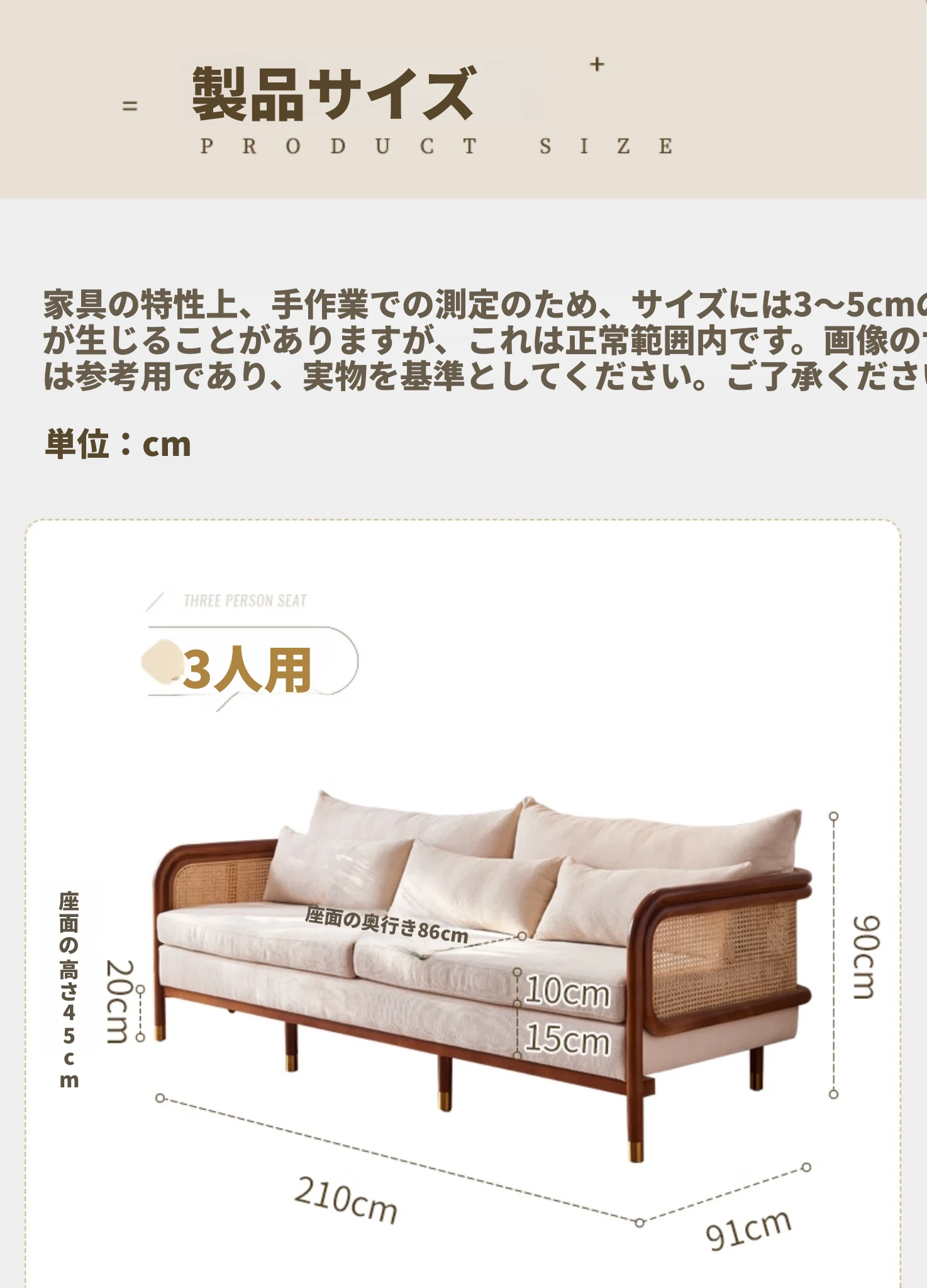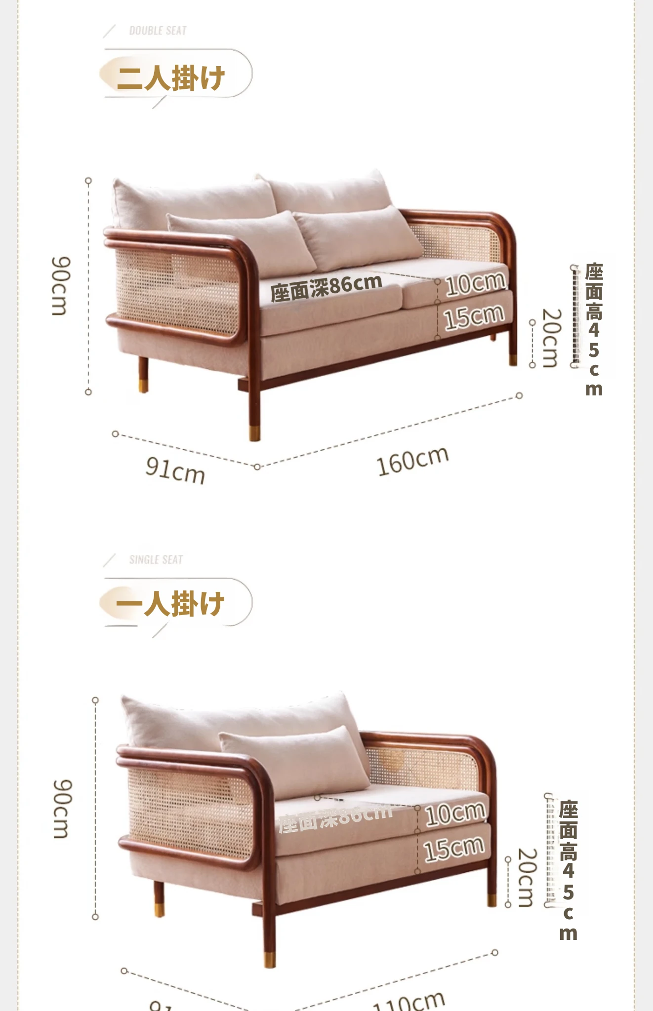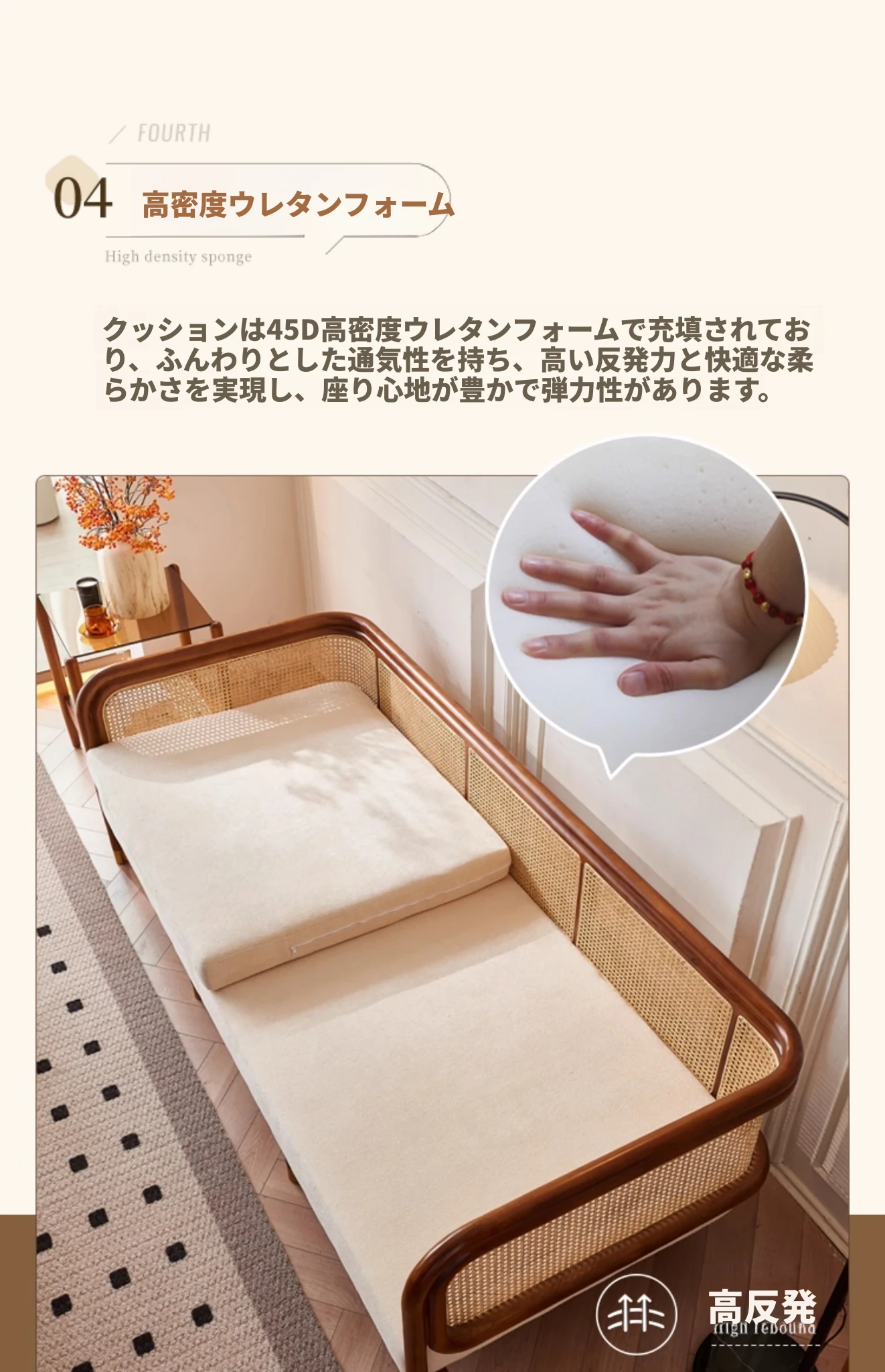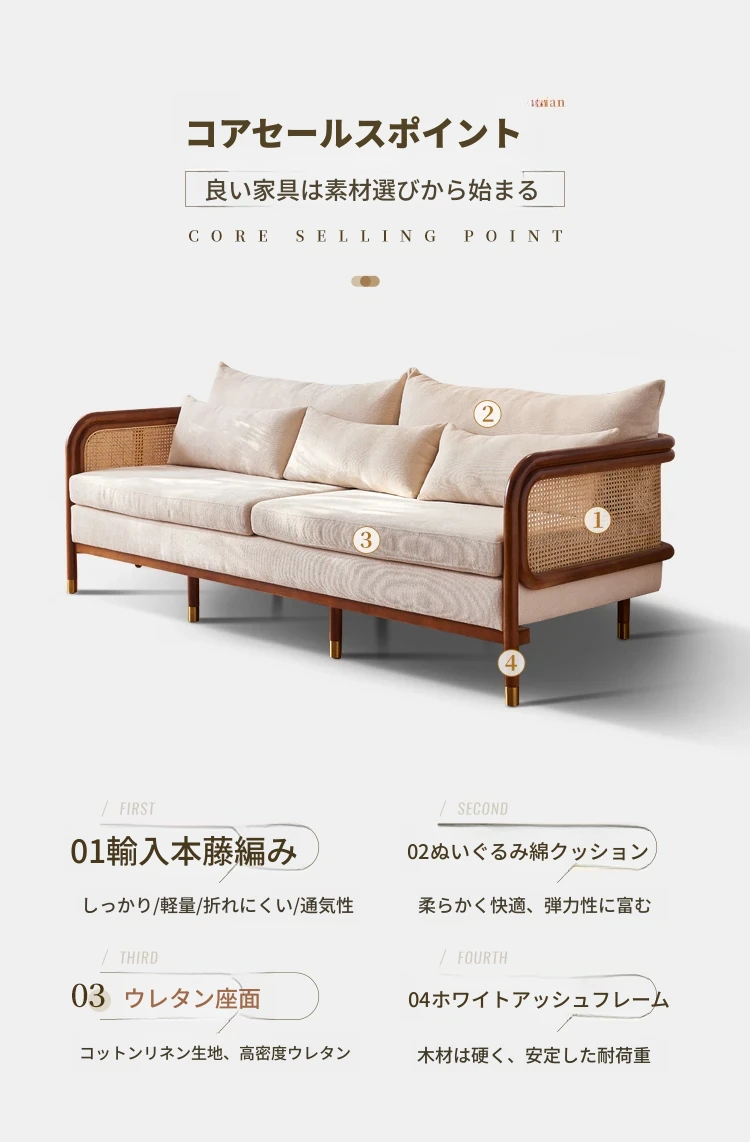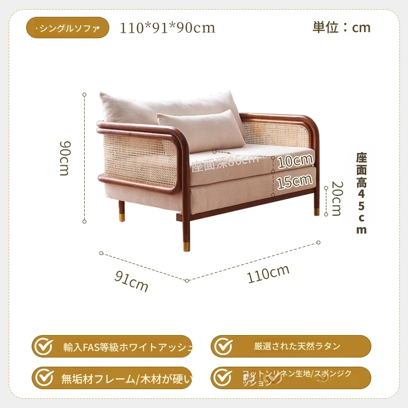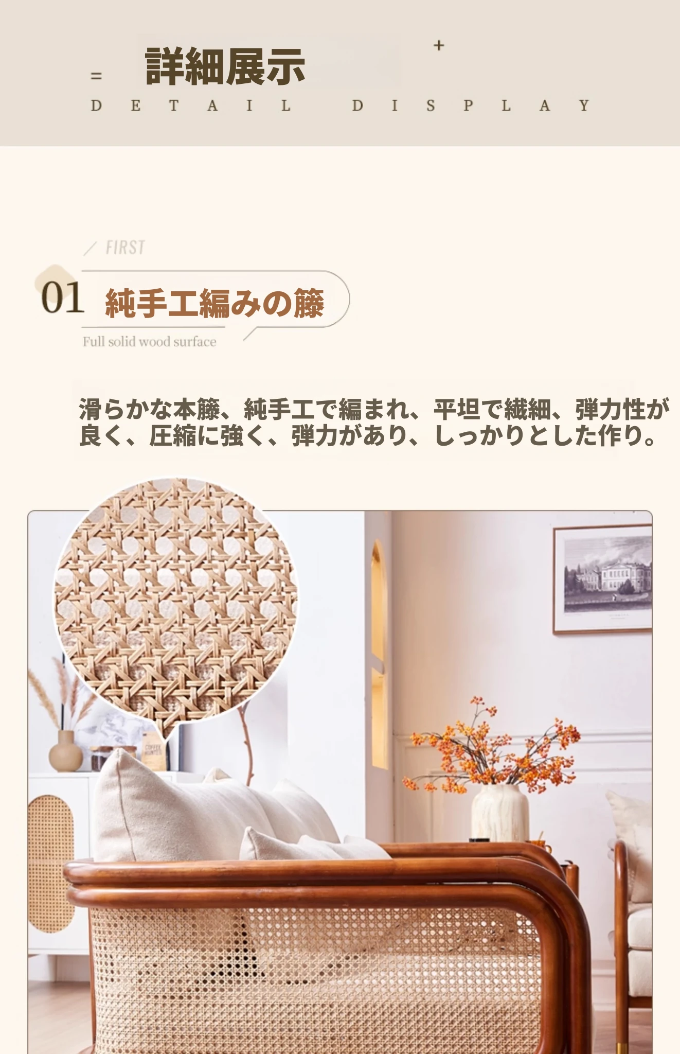 北欧風のラタン編みソファセット - ホワイトアッシュ無垢材の一人用・三人用ラタンチェア、リビングルームにぴったりの家庭用カジュアルファブリックラタンソファ!快適さとスタイルを両立した素敵な空間を演出します。