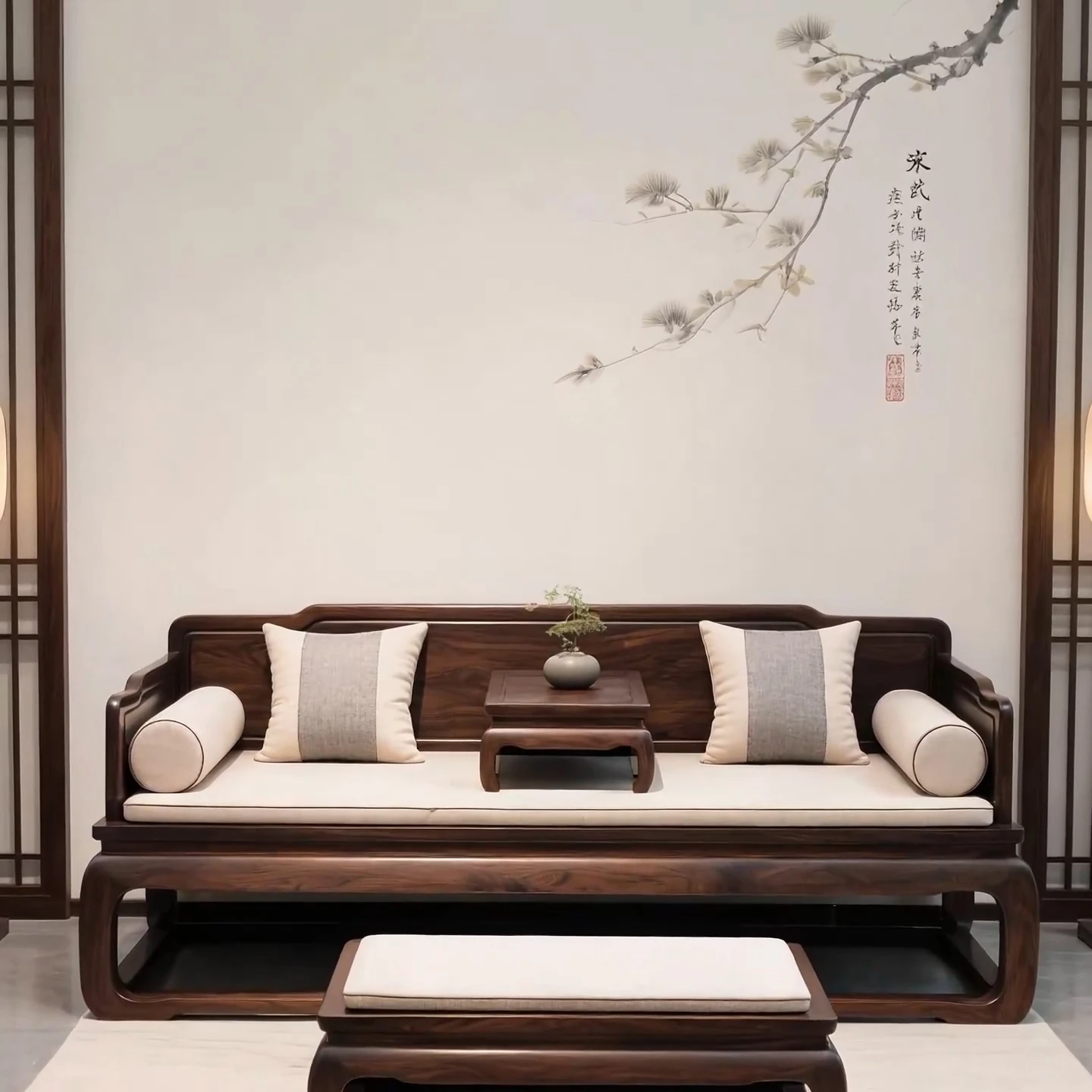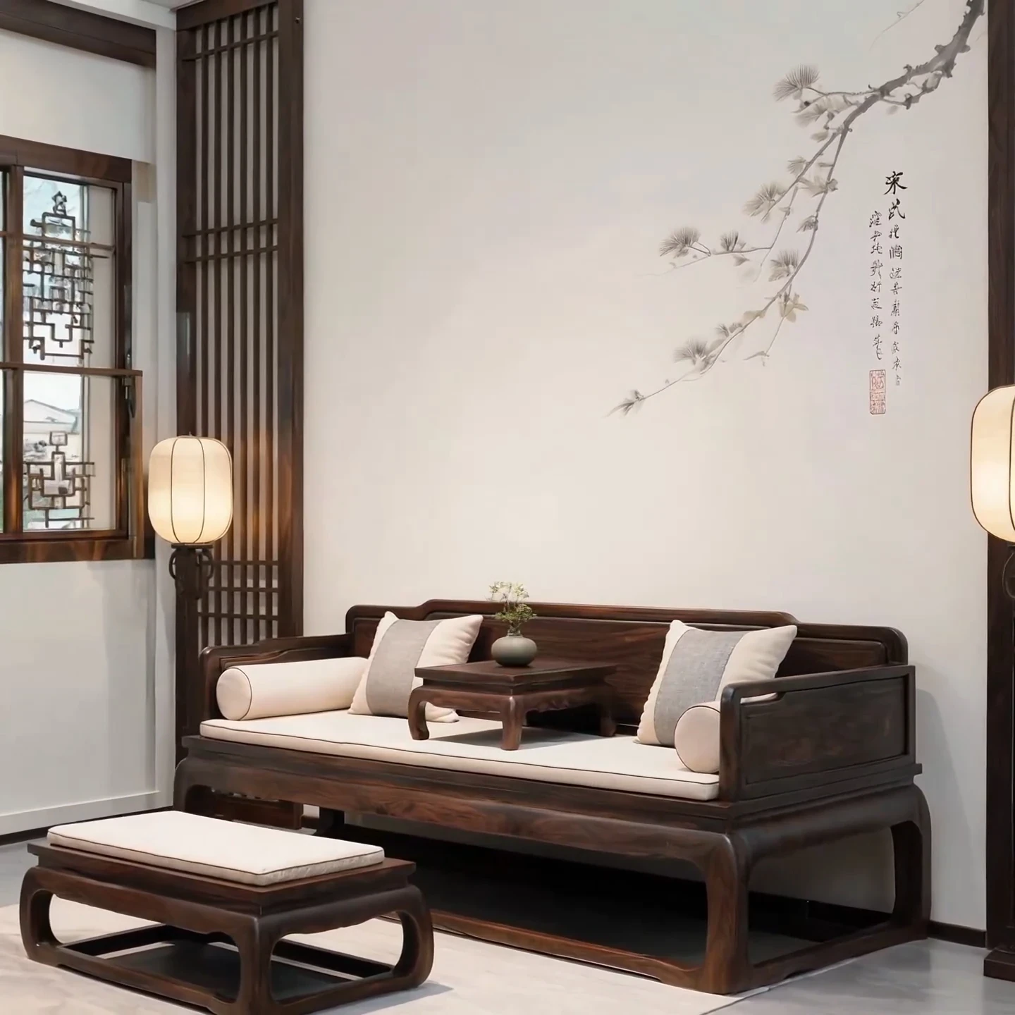 北米産ブラックウォールナットの新中式ロハンベッド、リビングにぴったりの3人掛けソファ、炕テーブル、純粋な無垢材使用のモダン家具。高級感溢れるデザインで、心地よい空間を演出します!