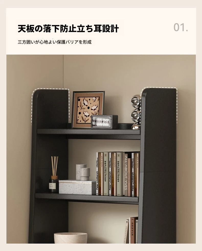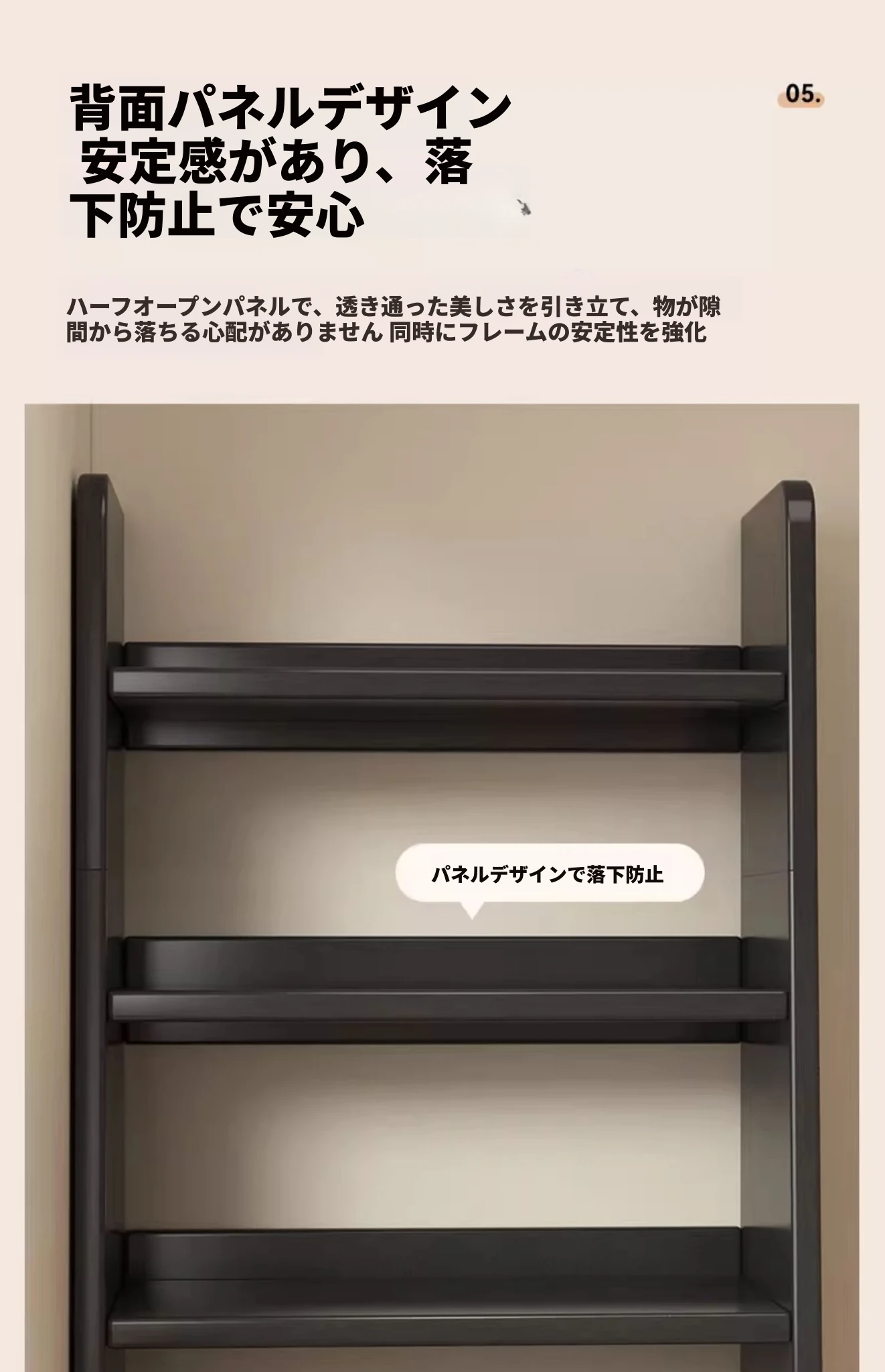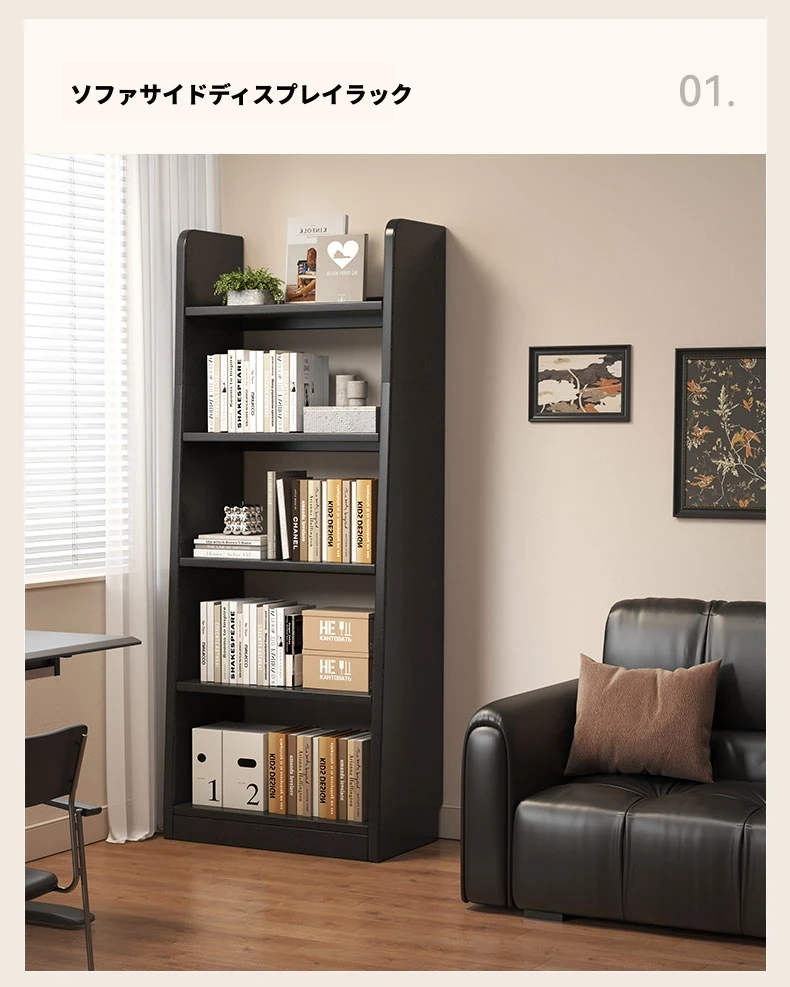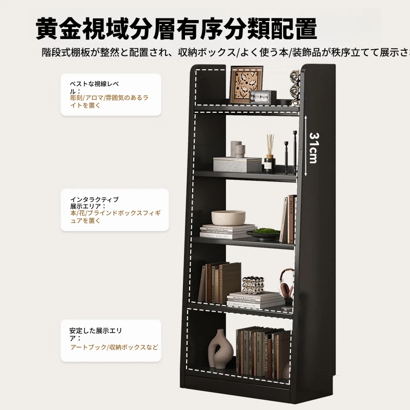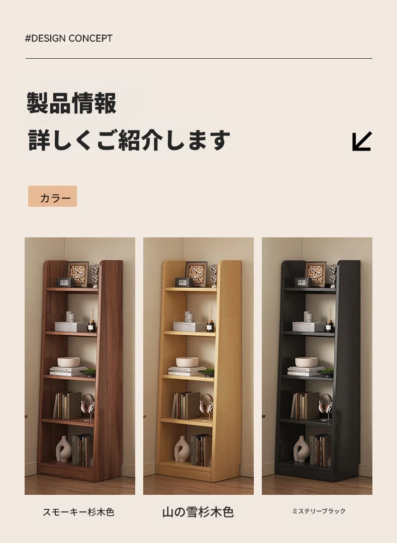 ナチュラルウッドのフロアシェルフ - スペースを取らないスタイリッシュな収納家具!リビングにぴったりの壁寄せスリムキャビネット。書籍や小物を美しくディスプレイし、暮らしを彩ります。