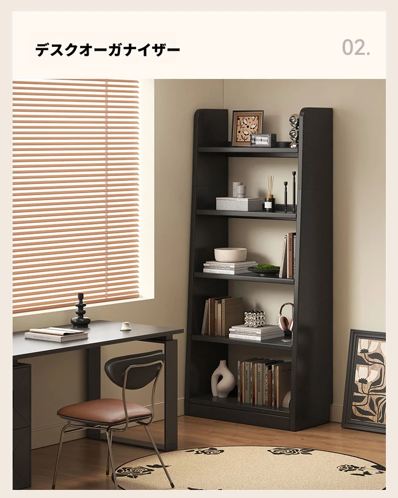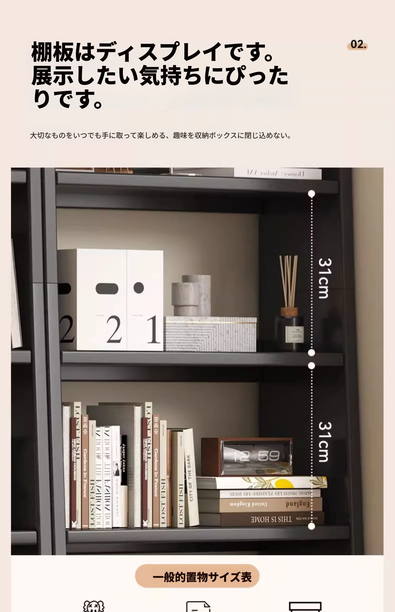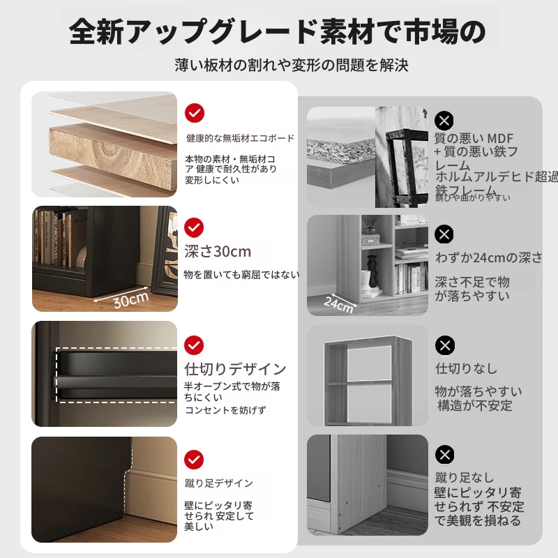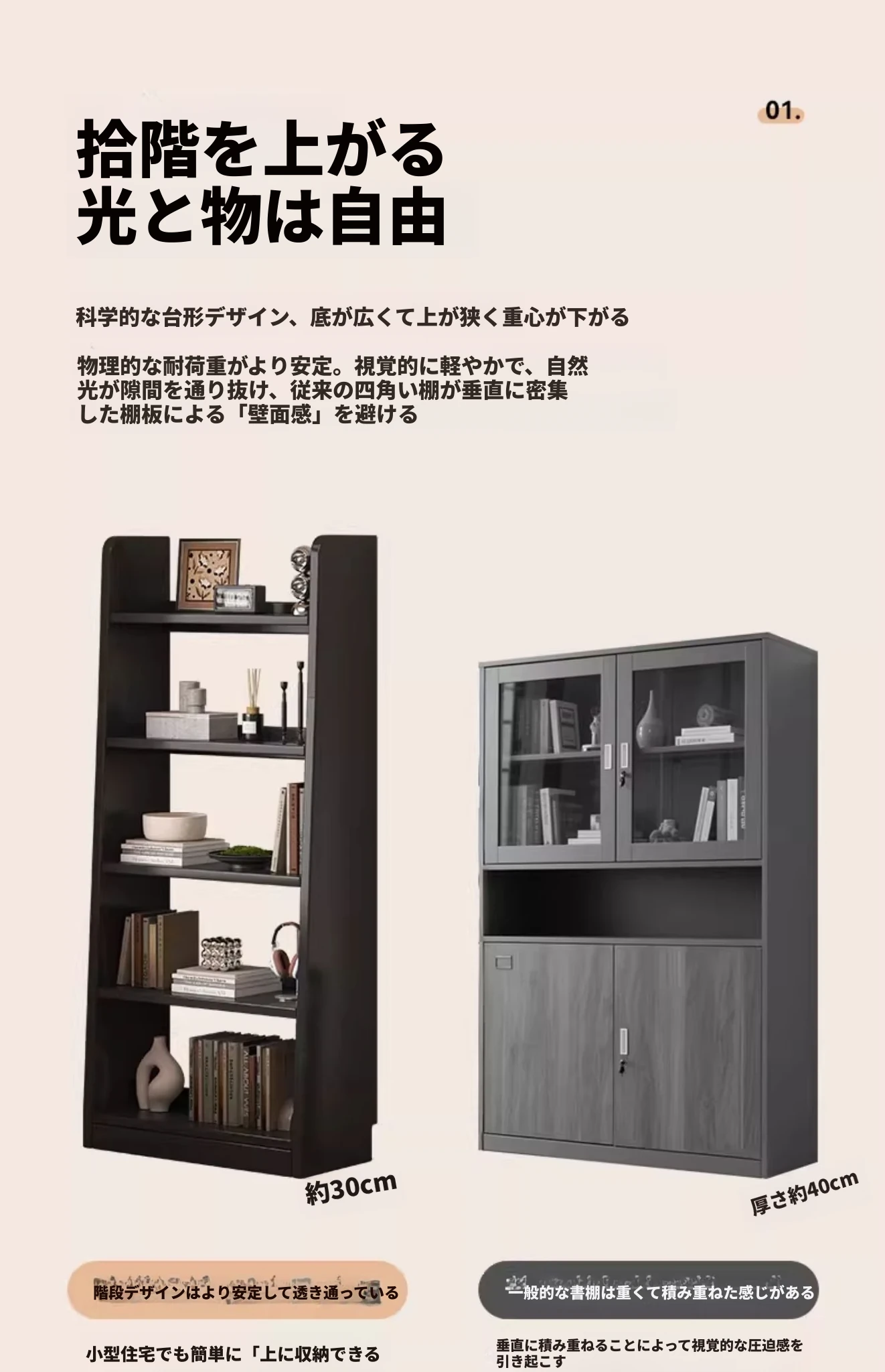 ナチュラルウッドのフロアシェルフ - スペースを取らないスタイリッシュな収納家具!リビングにぴったりの壁寄せスリムキャビネット。書籍や小物を美しくディスプレイし、暮らしを彩ります。