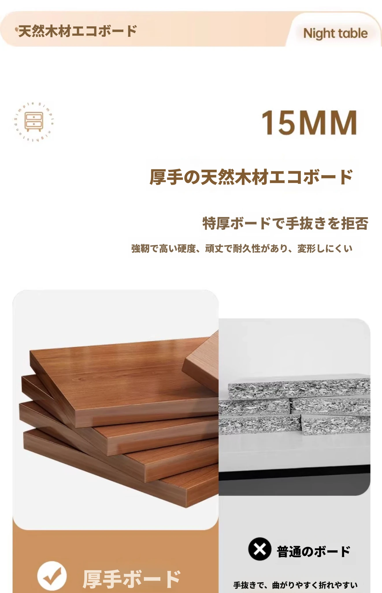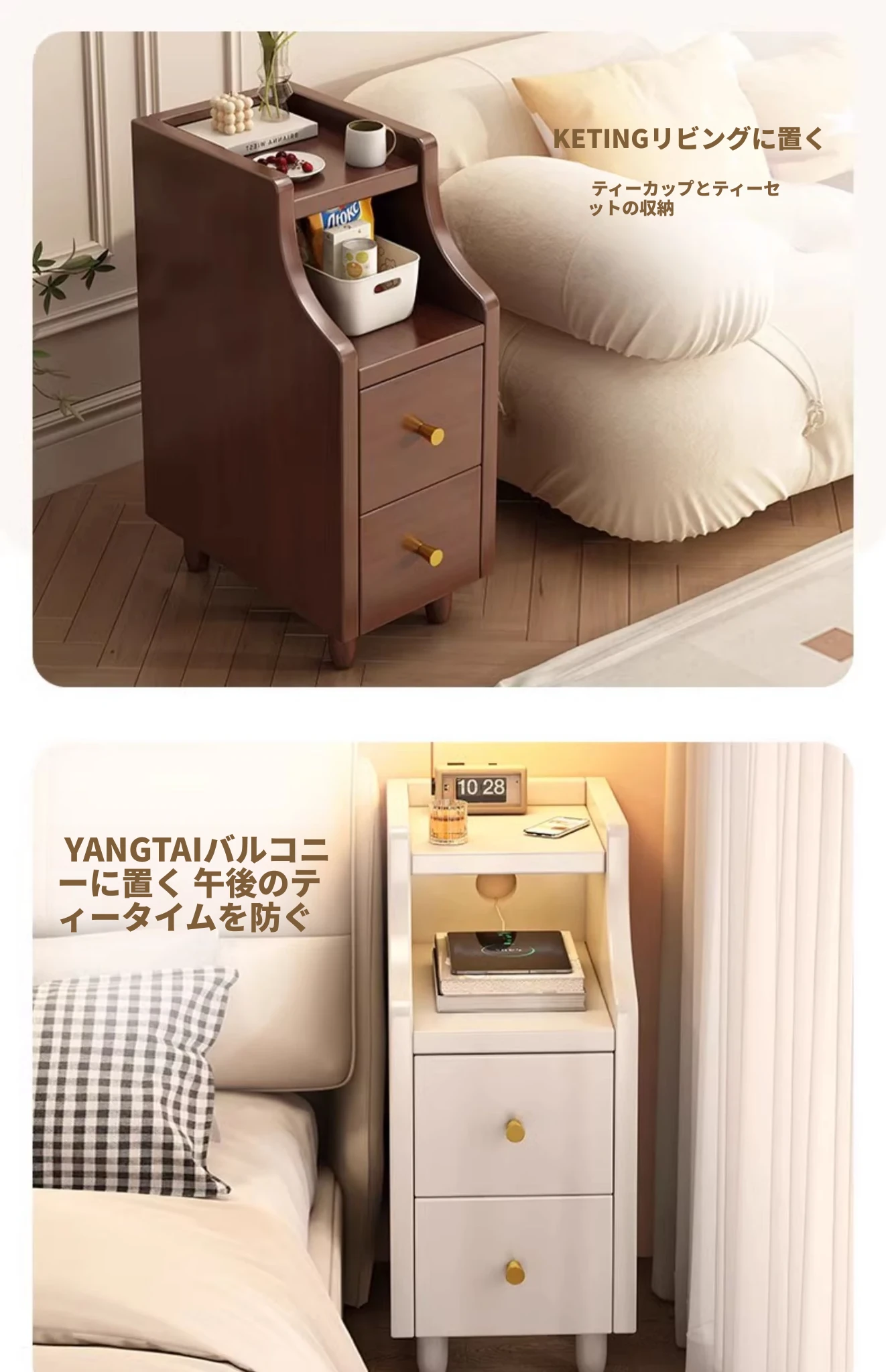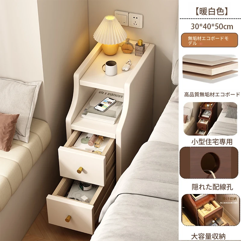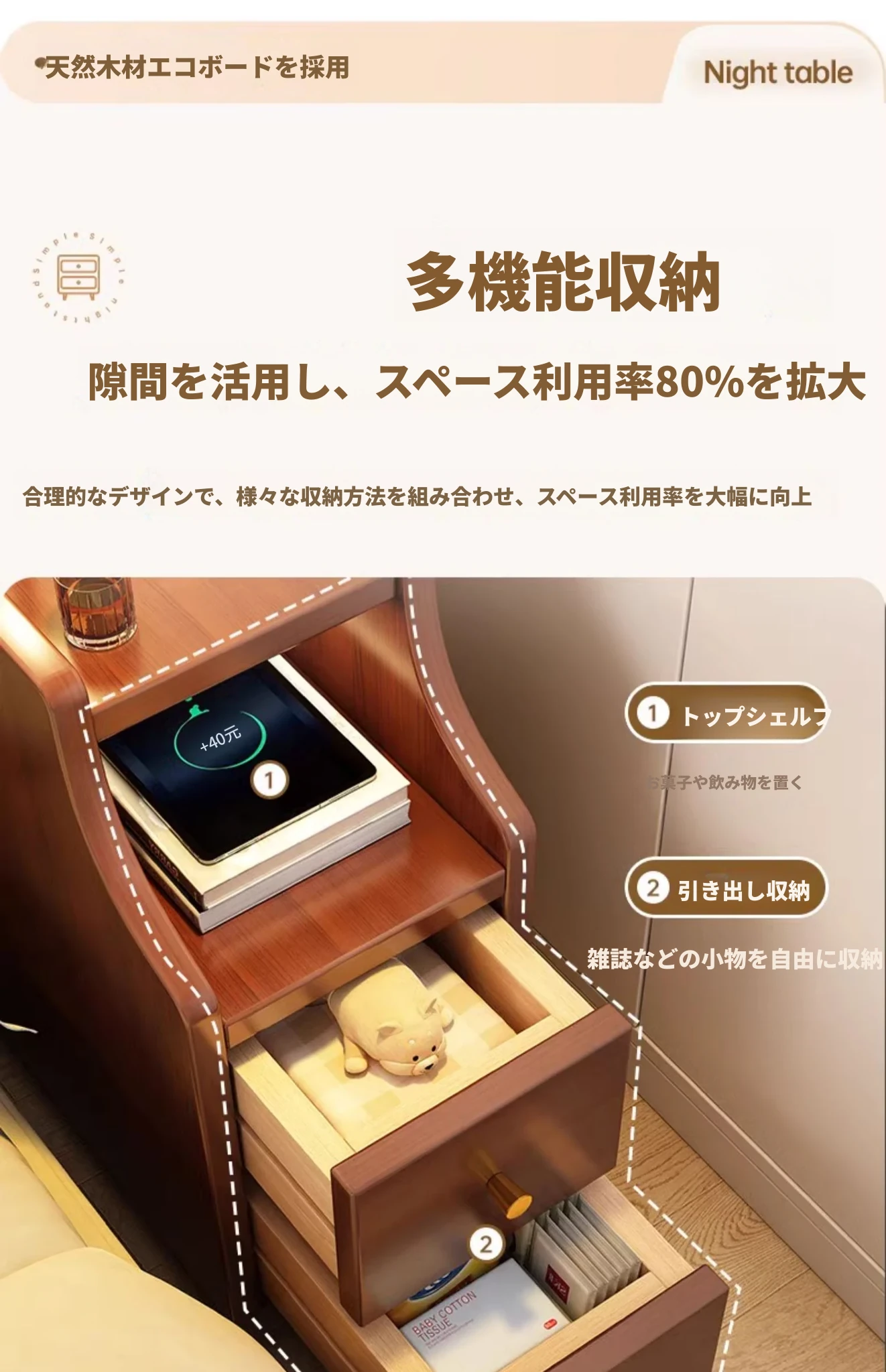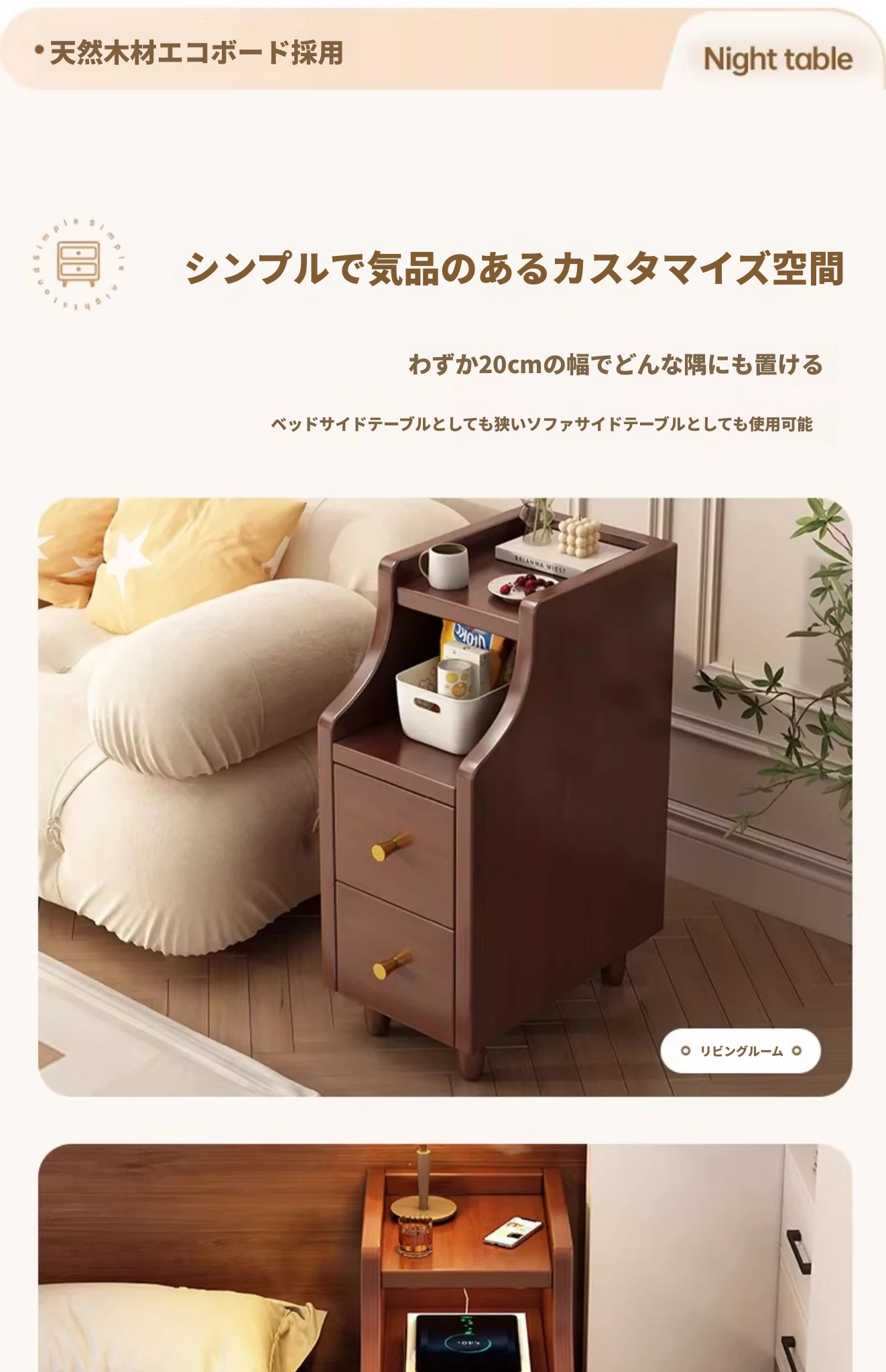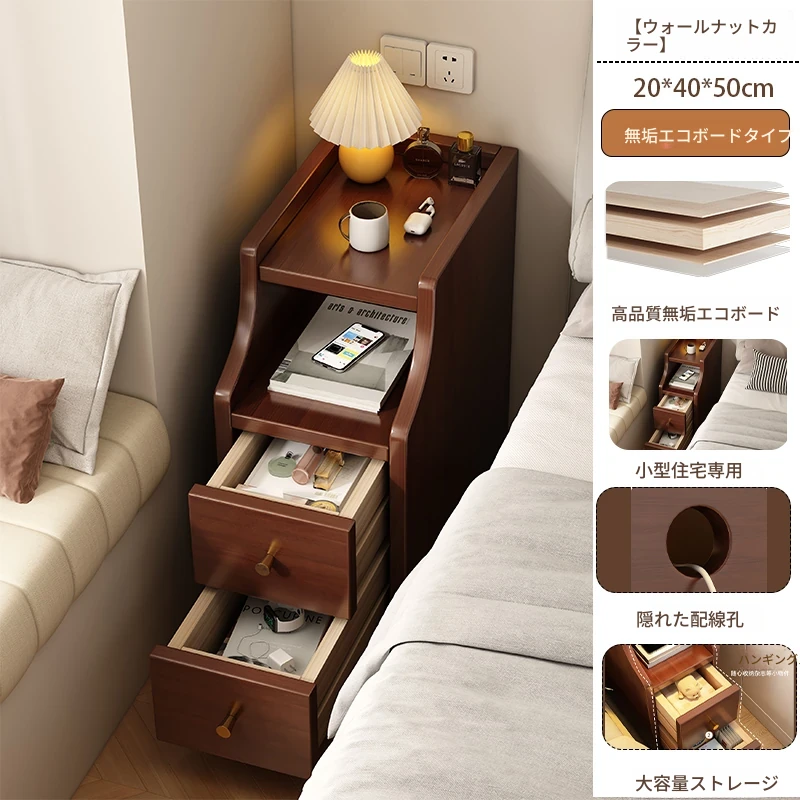 スリムなナイトテーブル!20cmの超薄型デザイン、エコボード製で、狭い隙間にもピッタリフィット。自宅の寝室に最適な収納ソリューションで、スタイリッシュに整理整頓!
