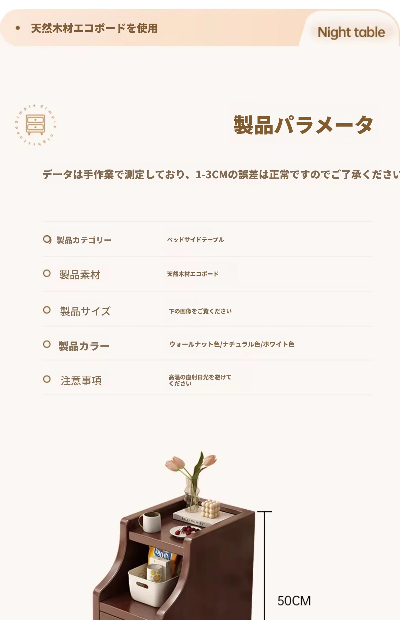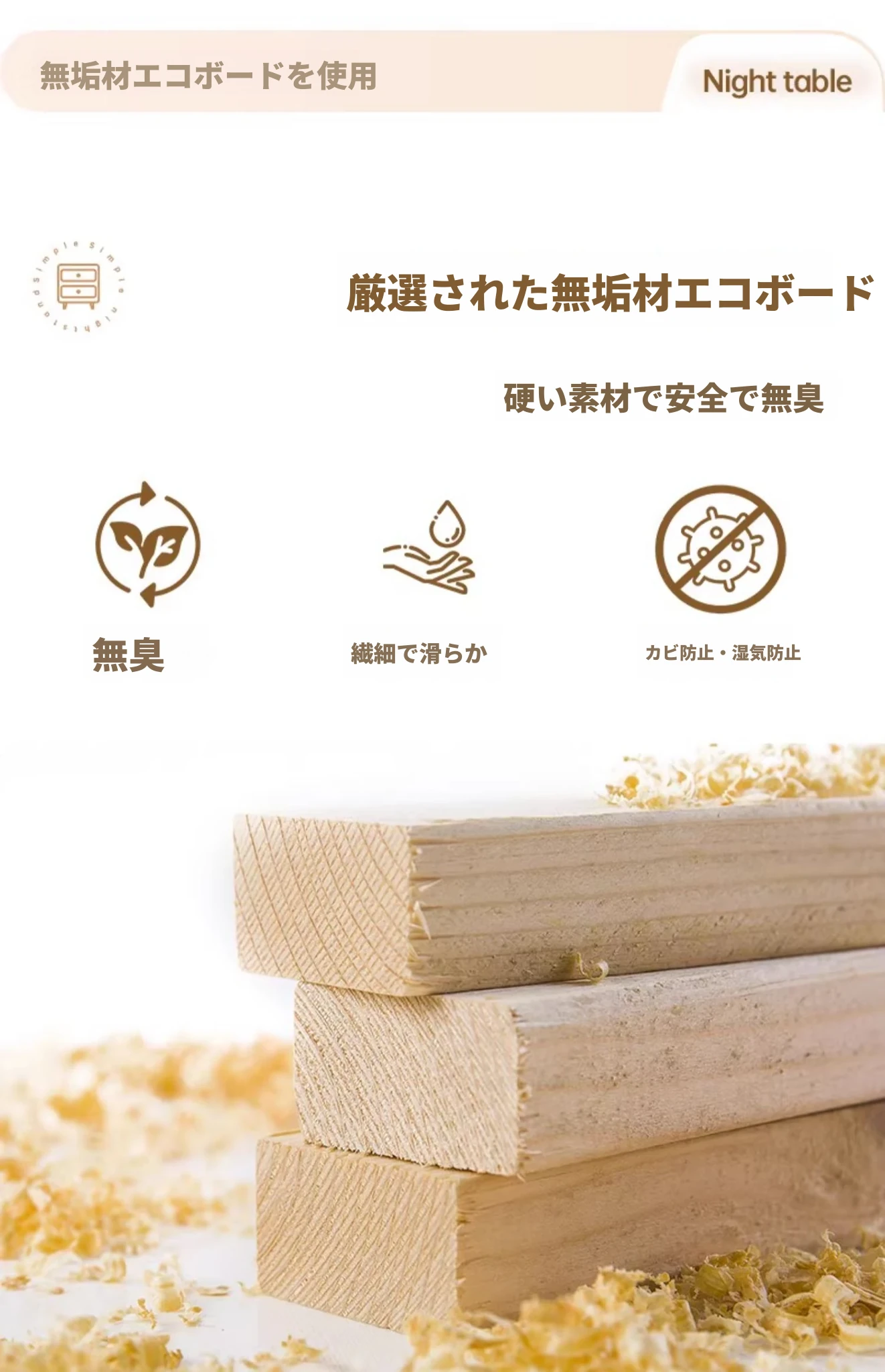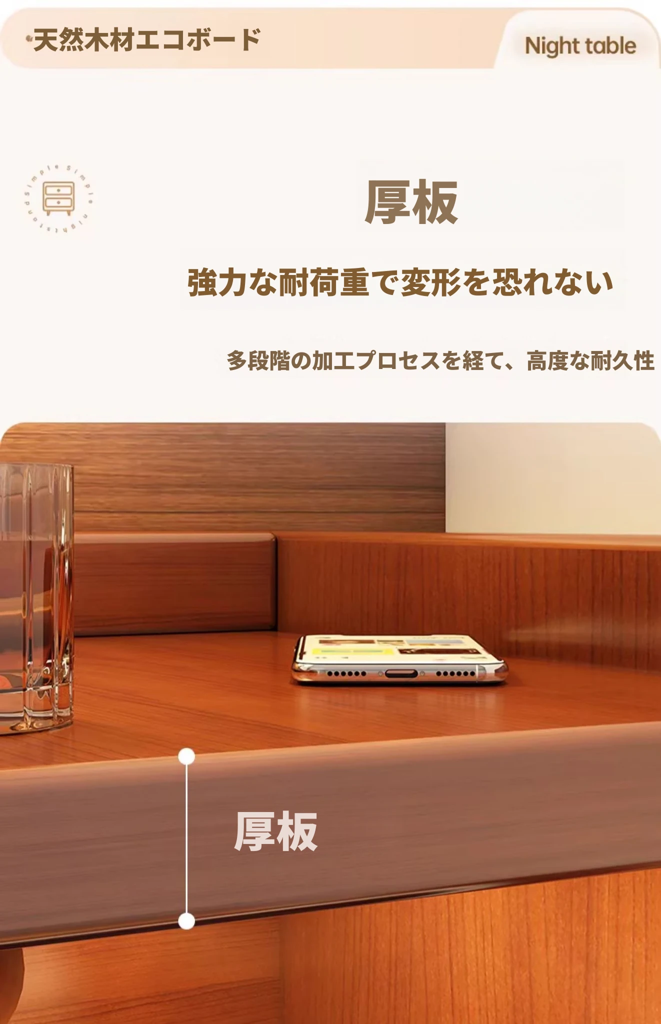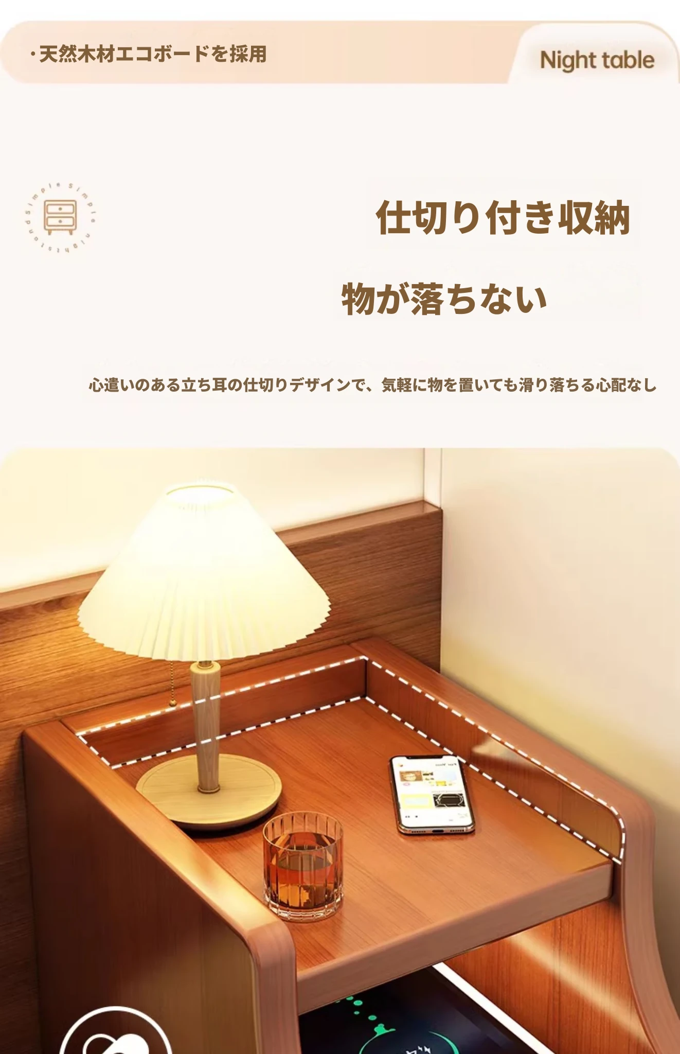 スリムなナイトテーブル!20cmの超薄型デザイン、エコボード製で、狭い隙間にもピッタリフィット。自宅の寝室に最適な収納ソリューションで、スタイリッシュに整理整頓!