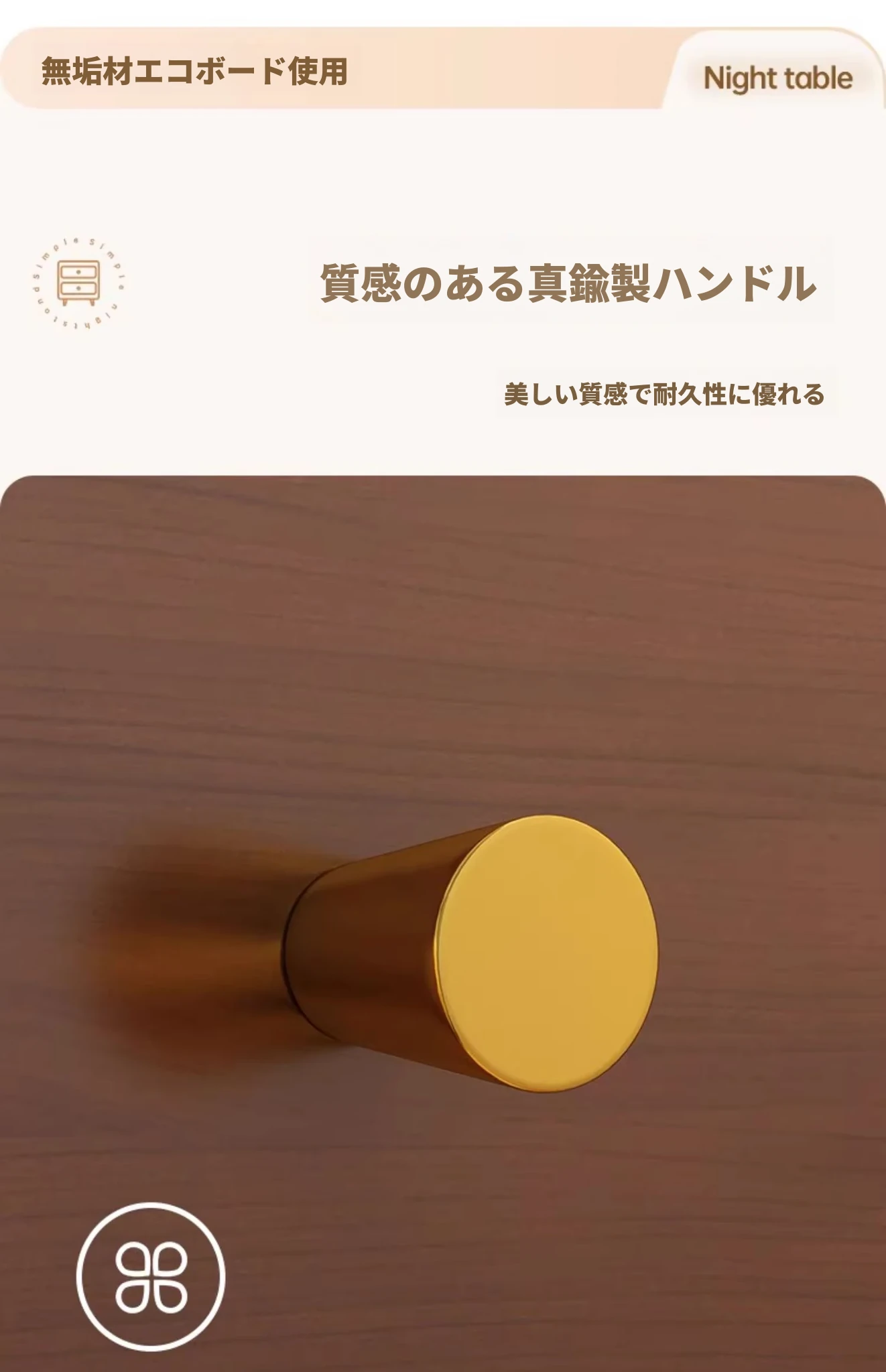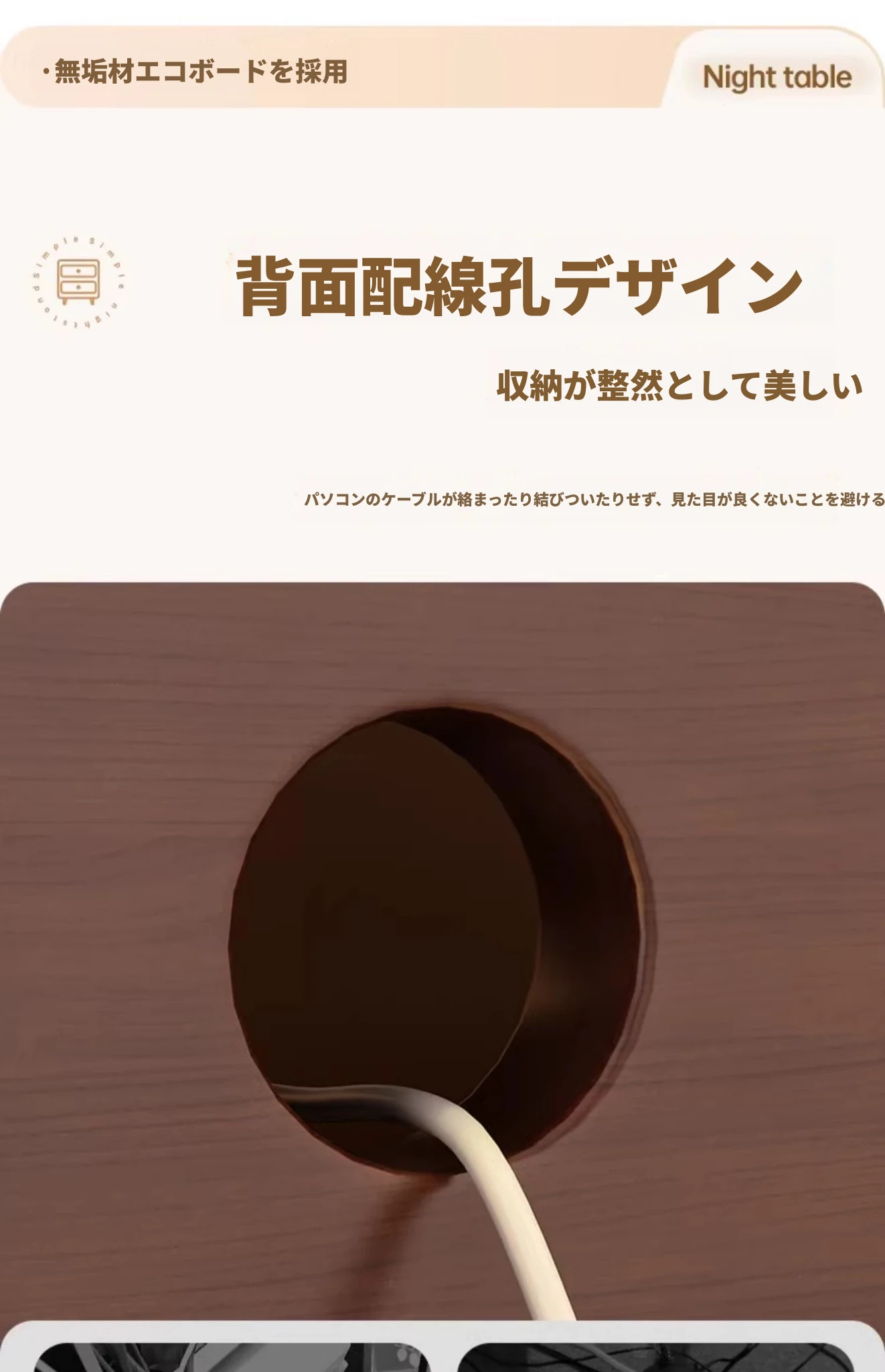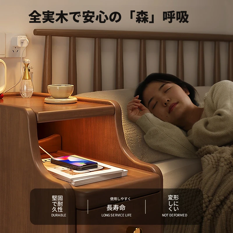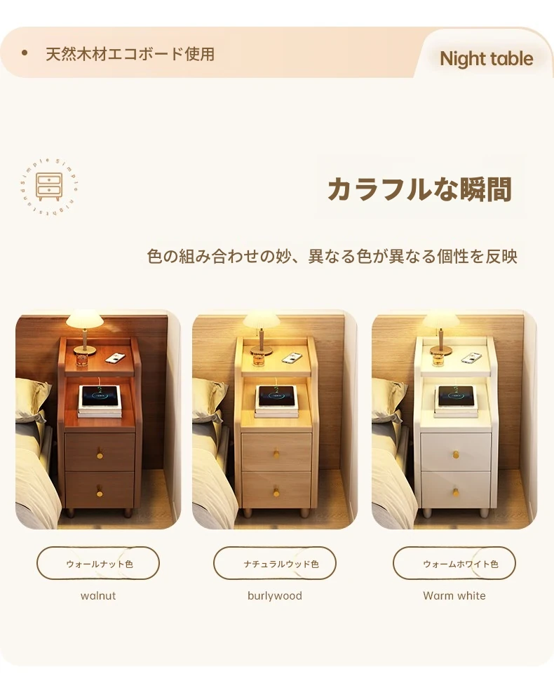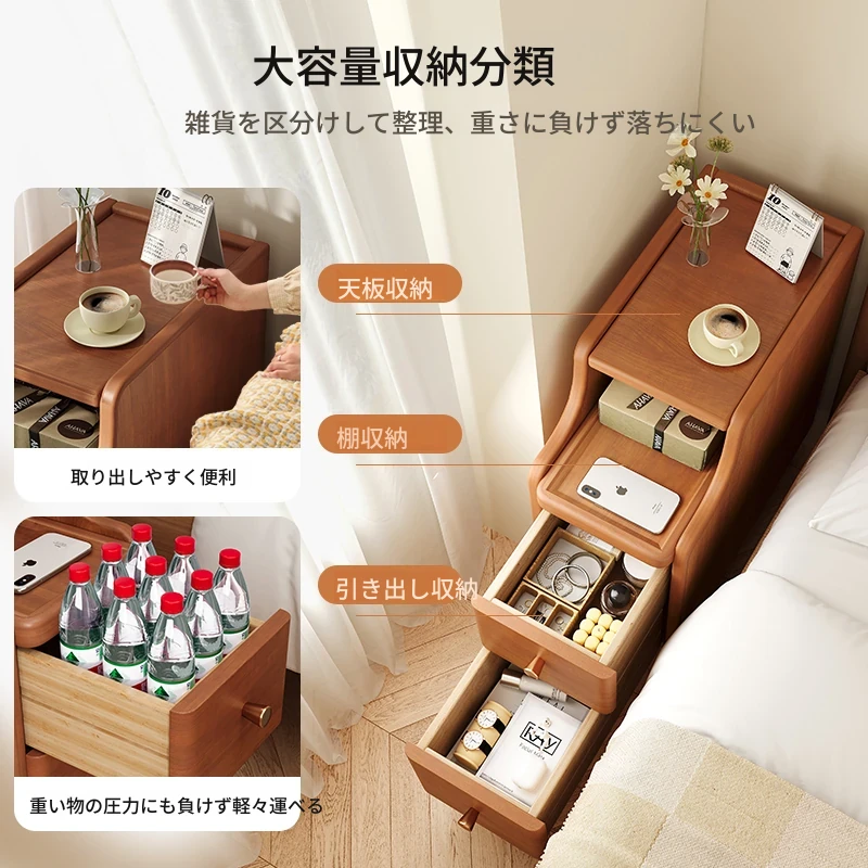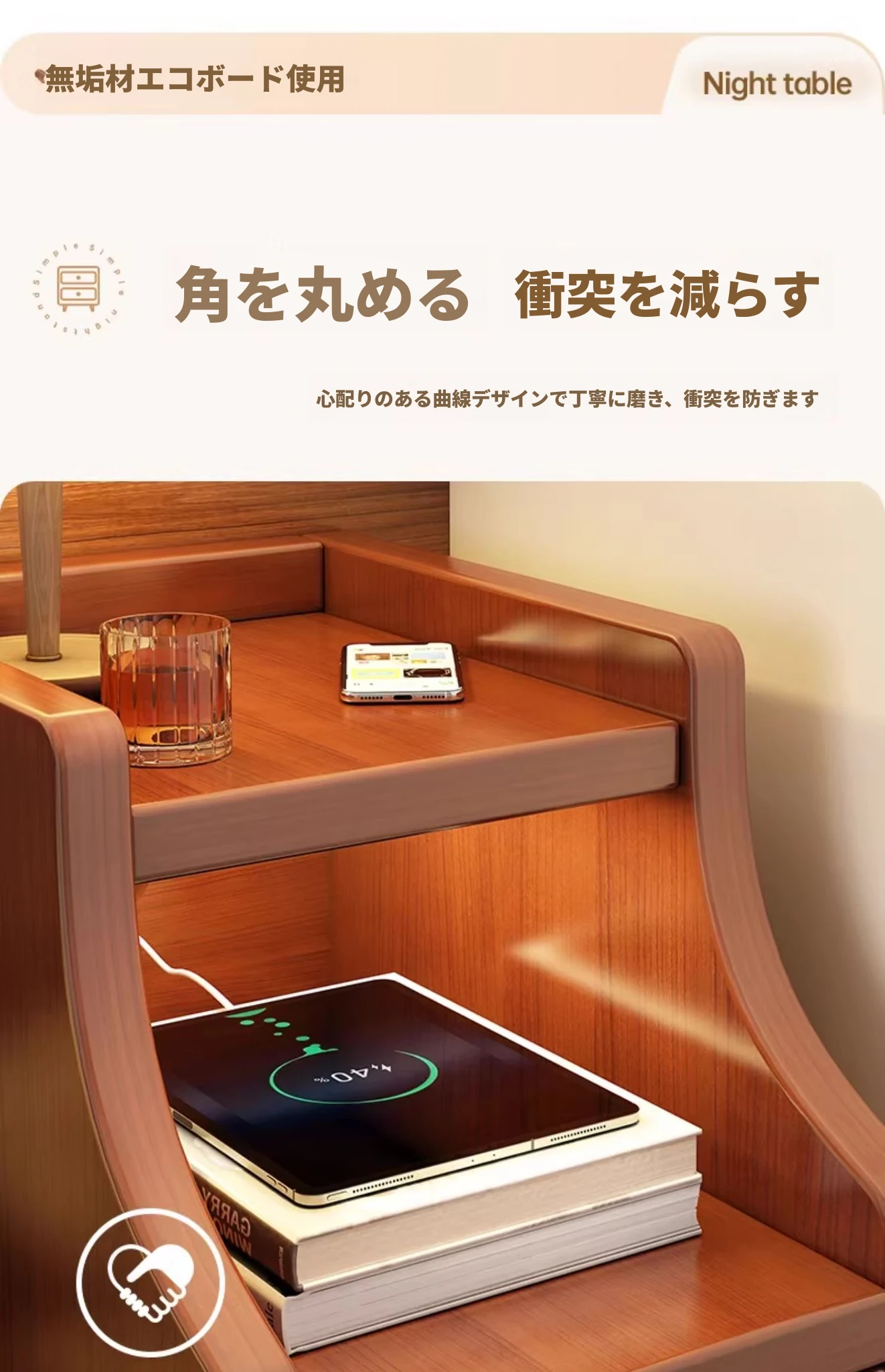 スリムなナイトテーブル!20cmの超薄型デザイン、エコボード製で、狭い隙間にもピッタリフィット。自宅の寝室に最適な収納ソリューションで、スタイリッシュに整理整頓!