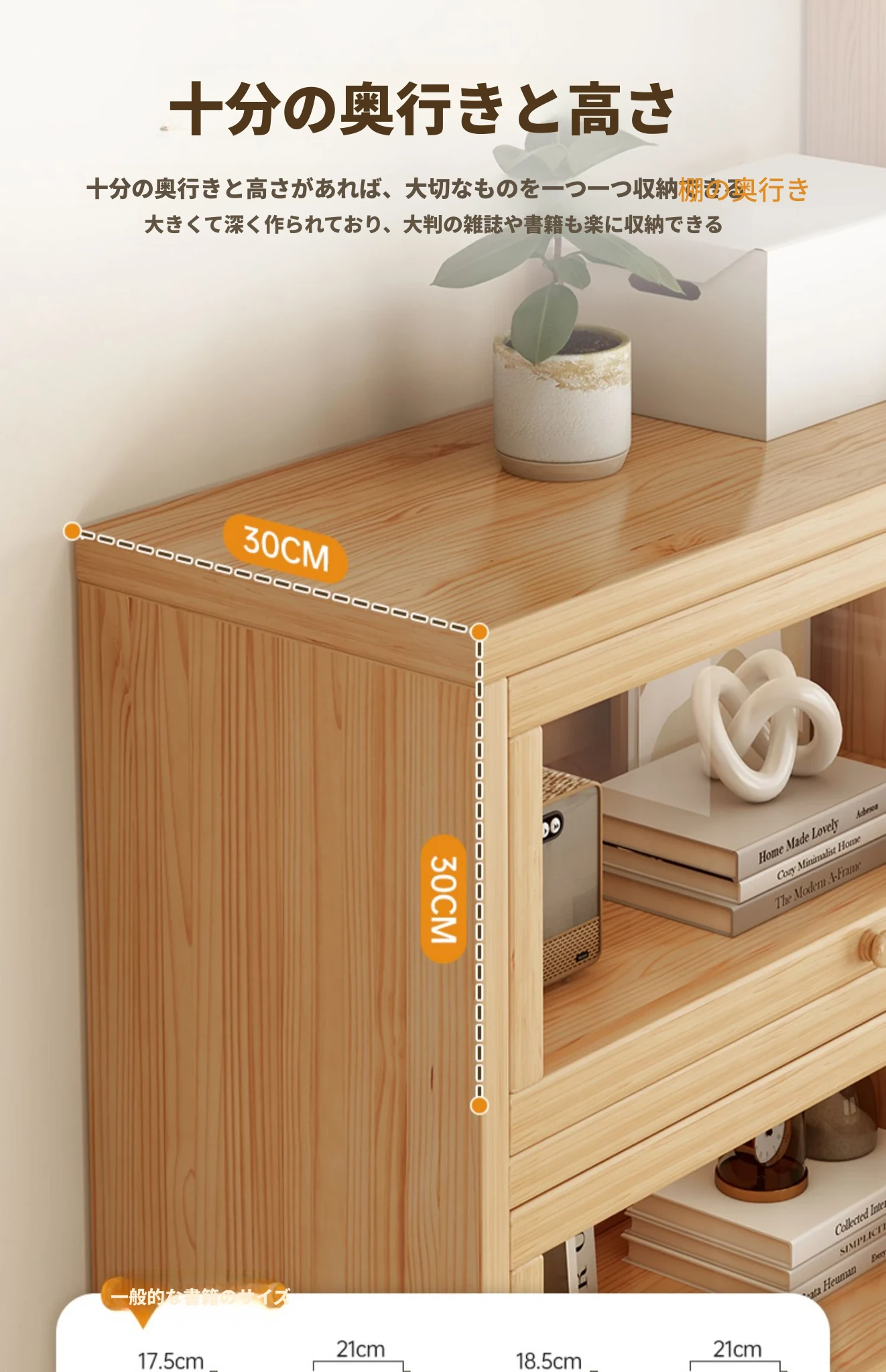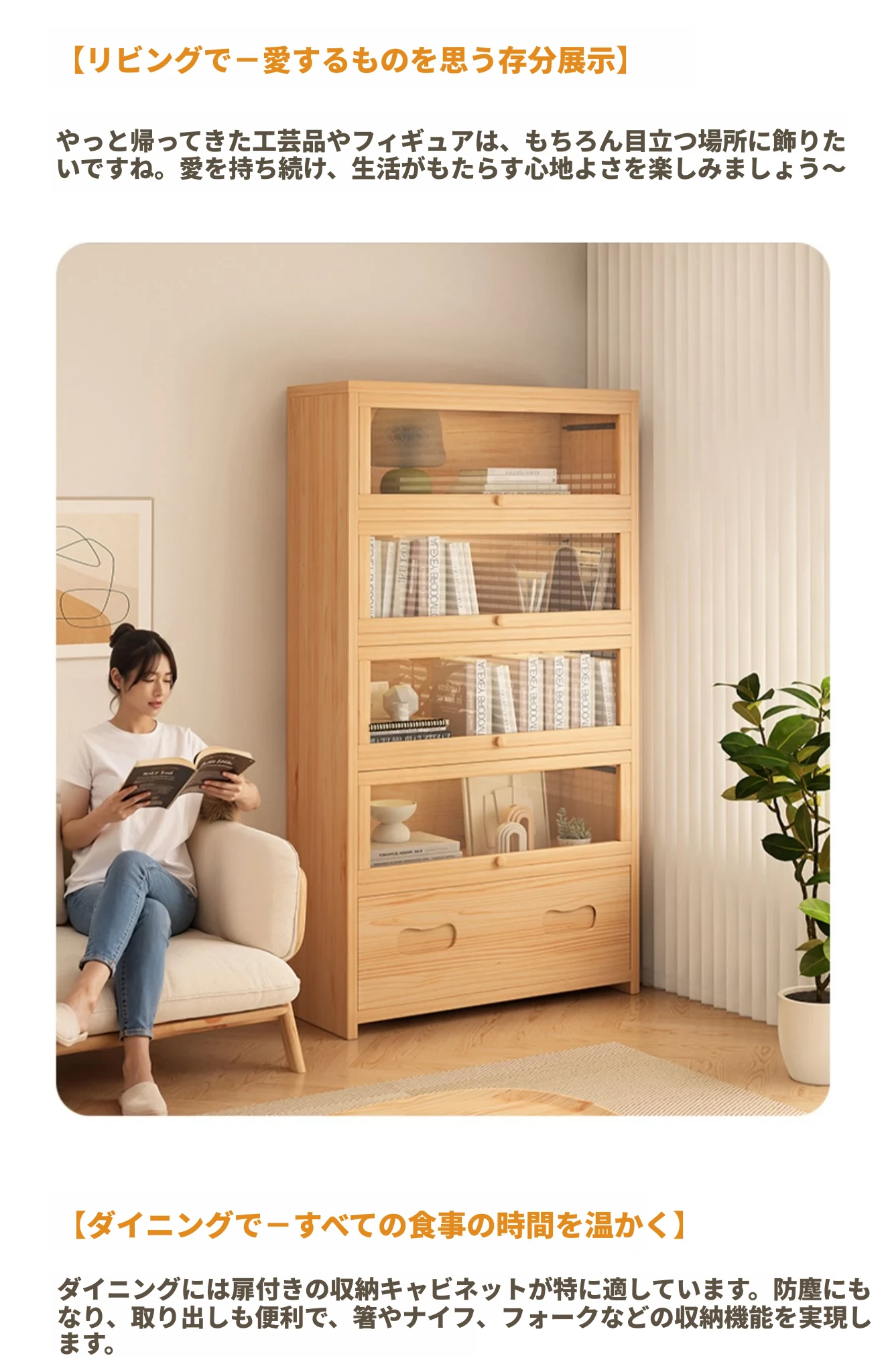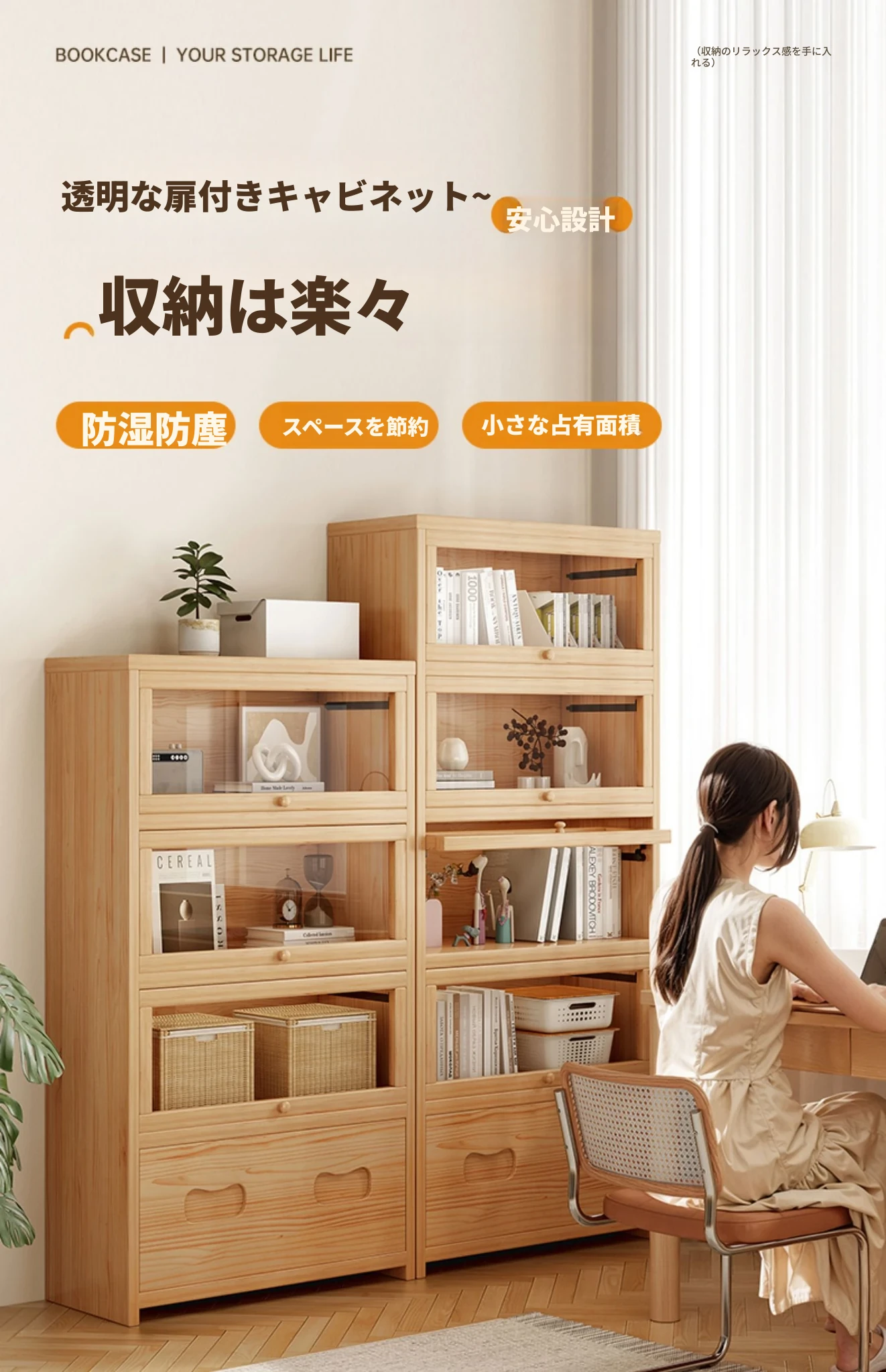 実木製の書棚!リビングにぴったりなスタイリッシュな展示キャビネット。壁に寄せて使える便利な収納棚。学生や家庭に最適!ドア付きで見た目もスッキリ。床置きタイプの収納家具で、あなたの空間を美しく整理整頓!