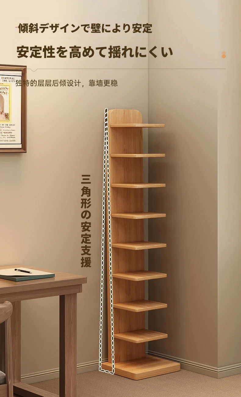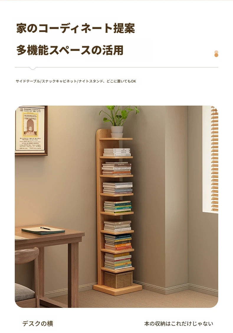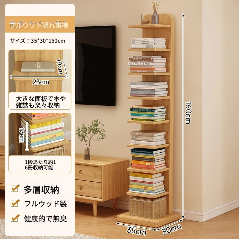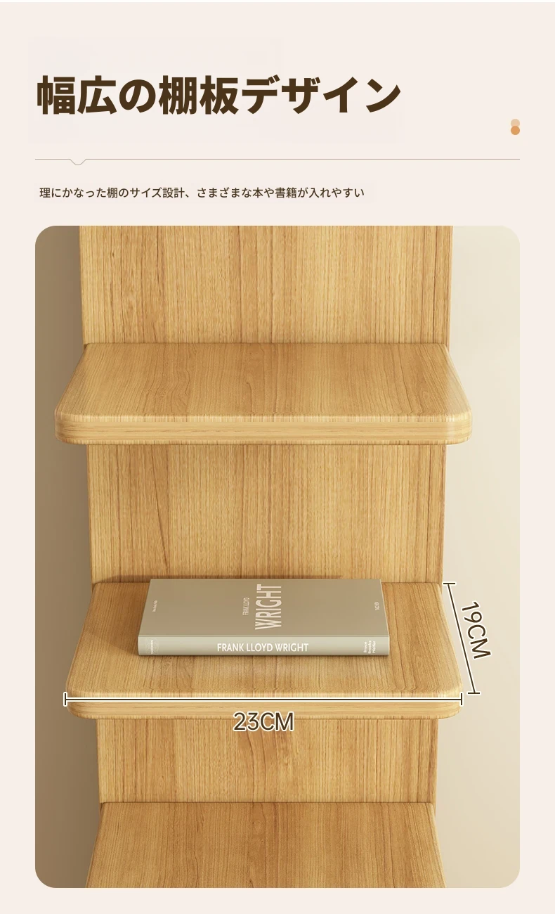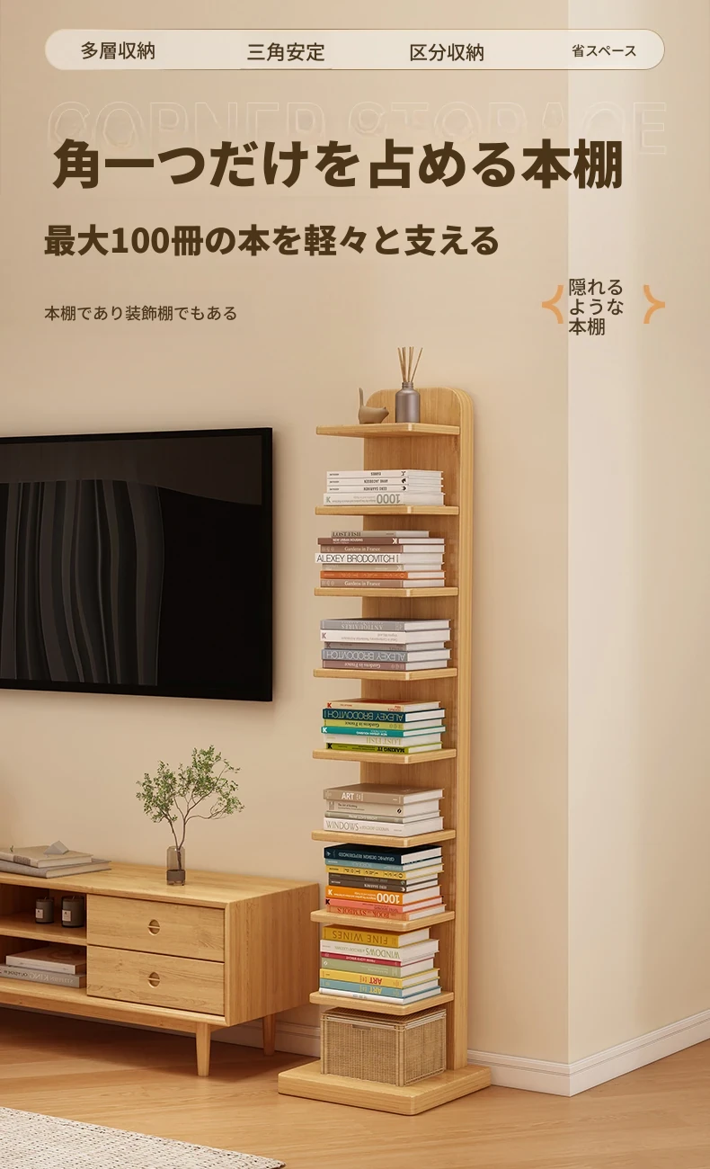 実木製の倒れ防止フロアブックシェルフ、スリムなデザインで目立たない収納、リビングや学生部屋に最適なコーナーキャビネット!限られたスペースでもおしゃれに収納できます。