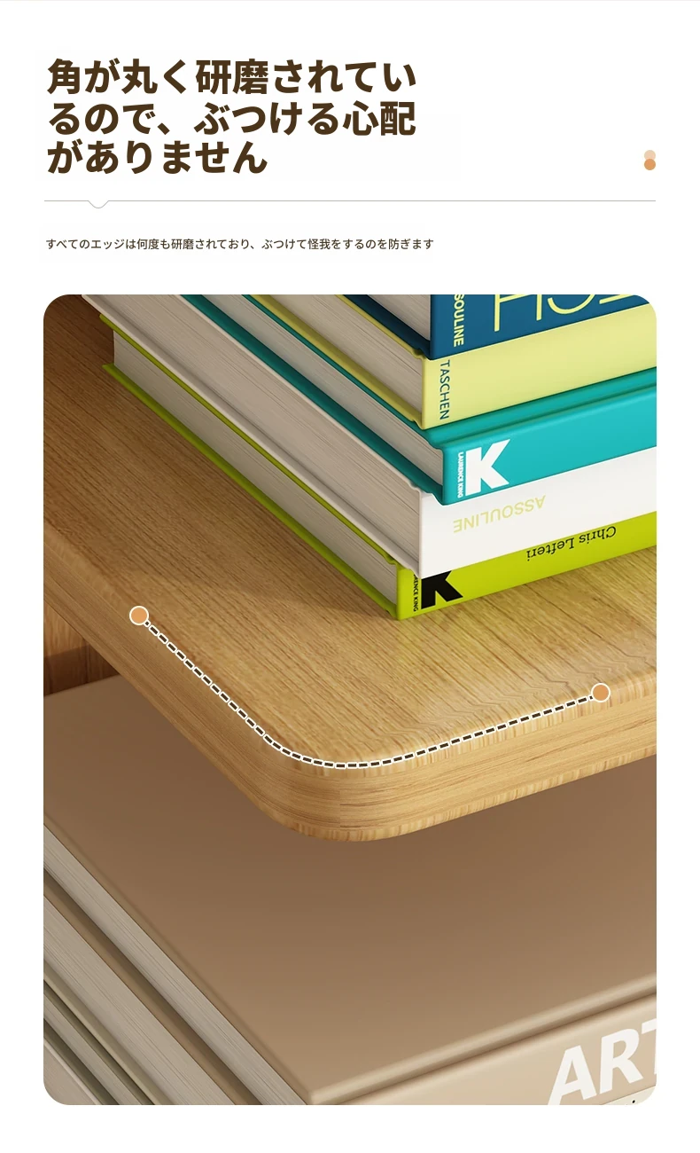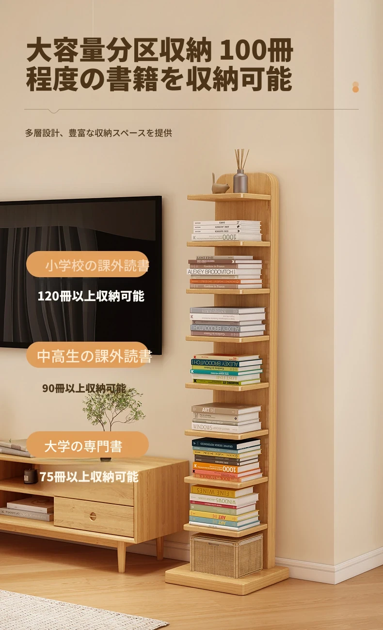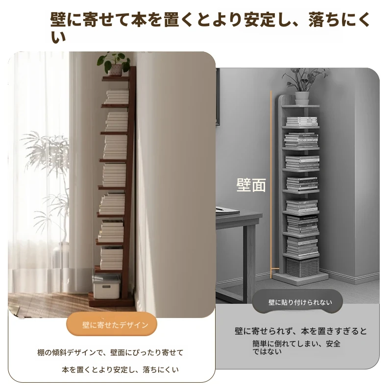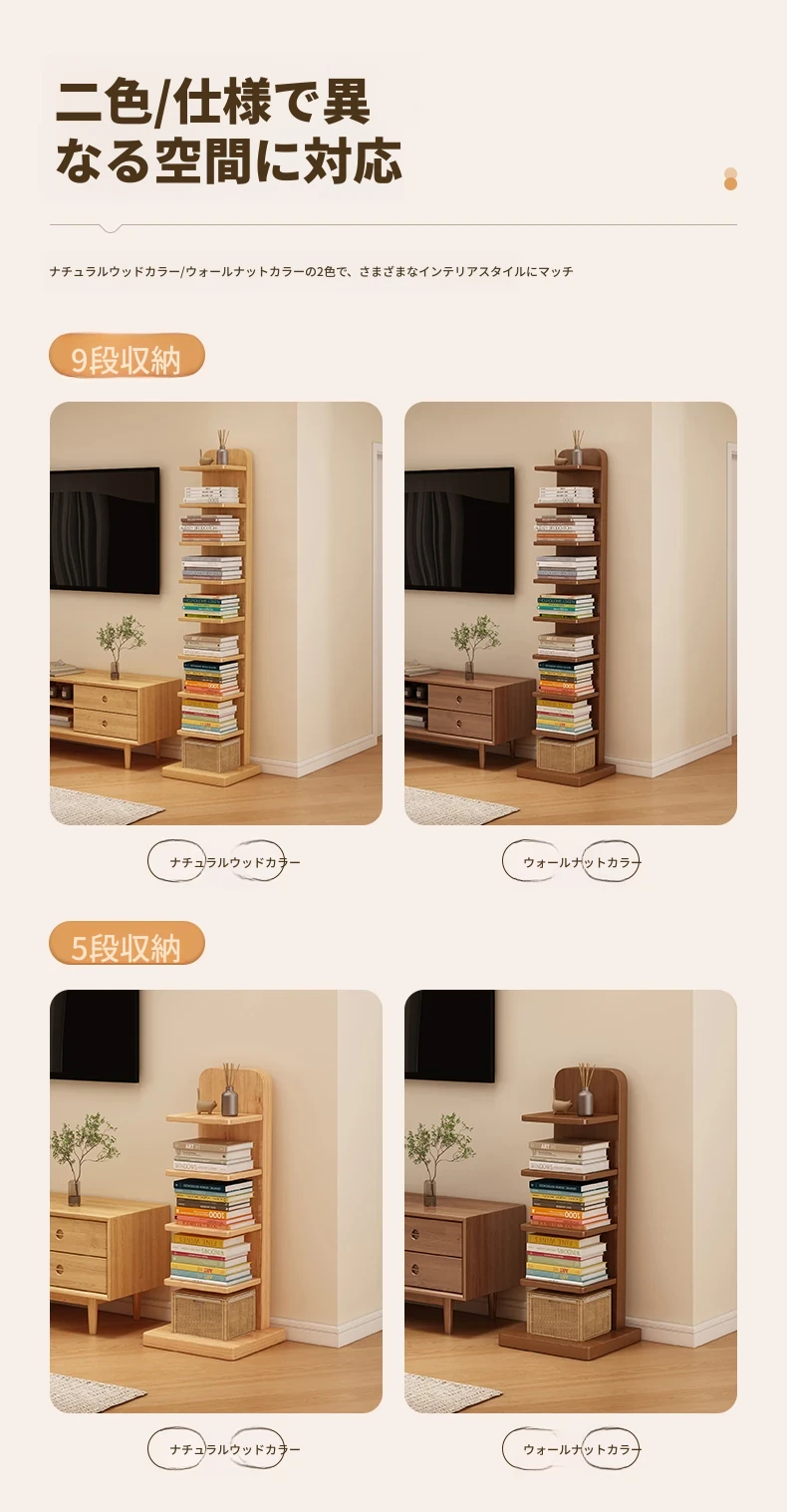 実木製の倒れ防止フロアブックシェルフ、スリムなデザインで目立たない収納、リビングや学生部屋に最適なコーナーキャビネット!限られたスペースでもおしゃれに収納できます。