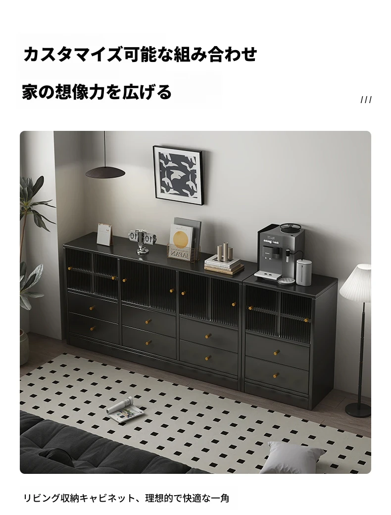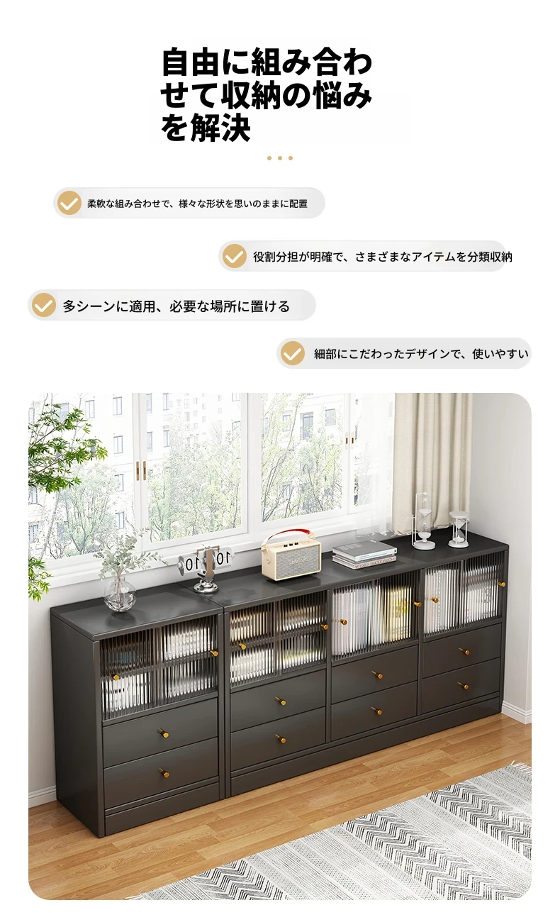 黒いフロア書棚・格子棚!リビングに最適なテレビ台、ティーキャビネット、ディスプレイキャビネット、ローボード、モジュラーキャビネット。自由に組み合わせて、あなたのスタイルを表現!