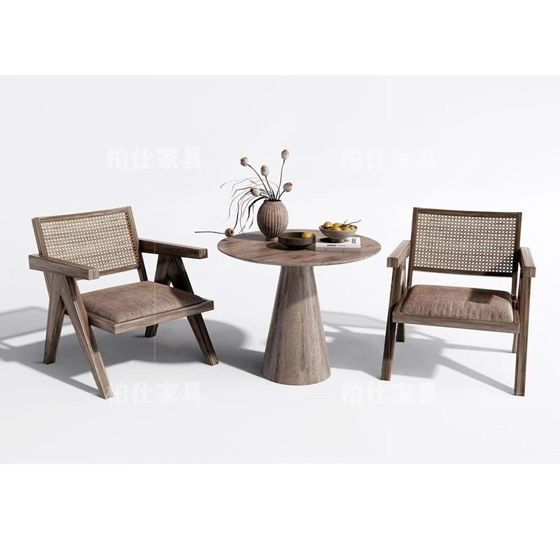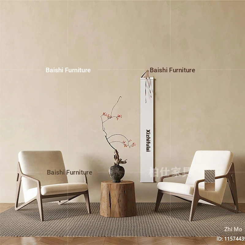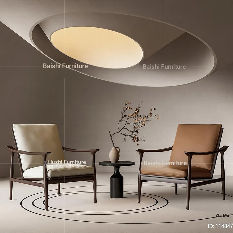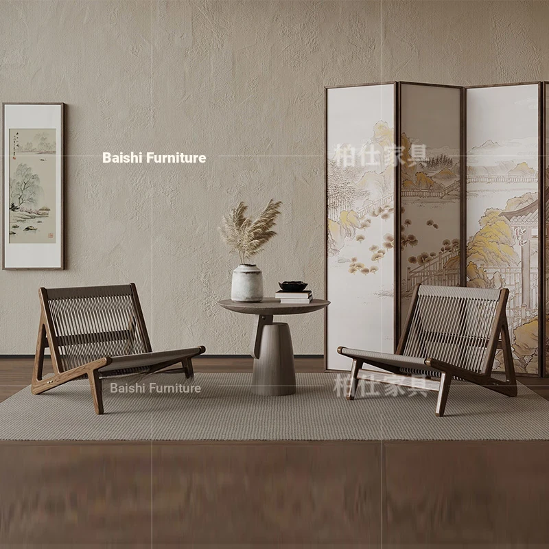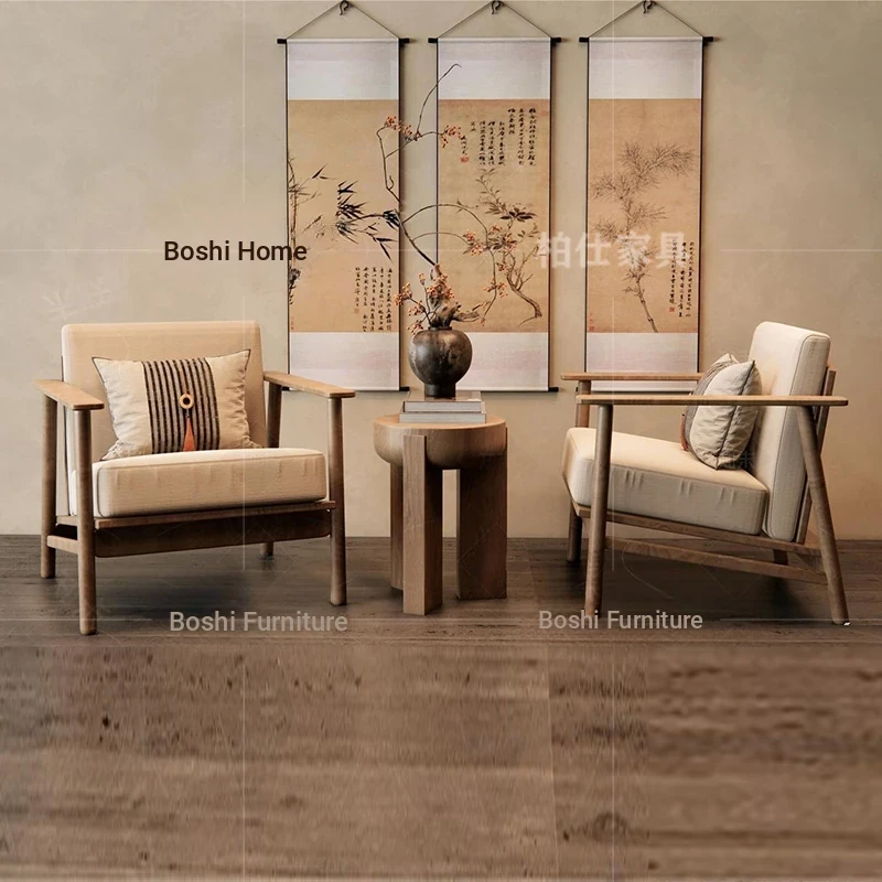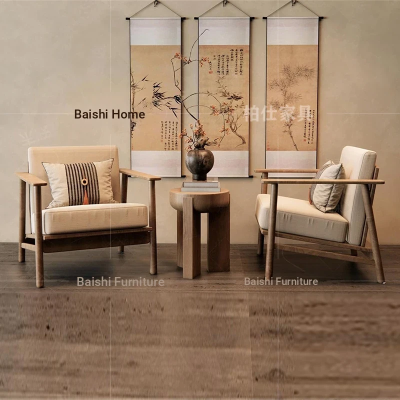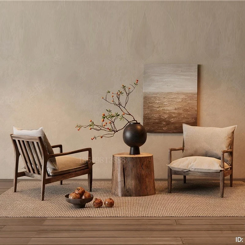 ヴィンテージ風の無垢材製シングルソファ椅子 - 侘寂スタイルのホテルや民宿に最適な中華風の客室休憩エリア用会議椅子。おしゃれで落ち着いた雰囲気を演出し、ゲストをお迎えするのに最適です!