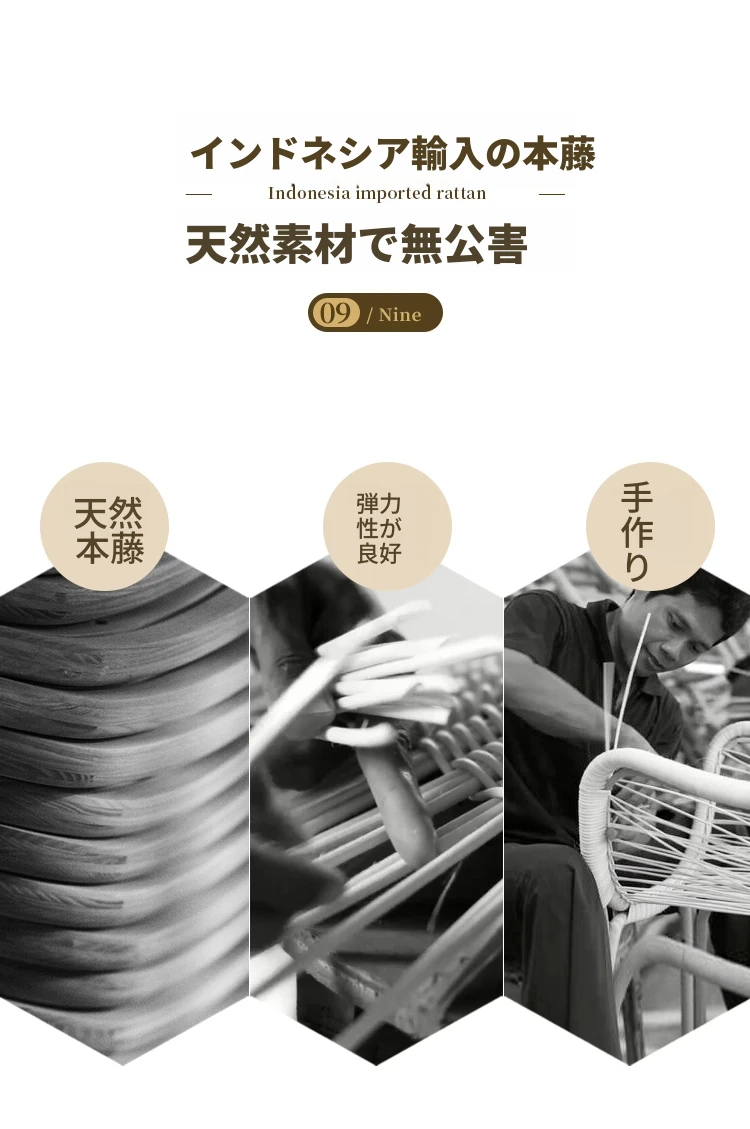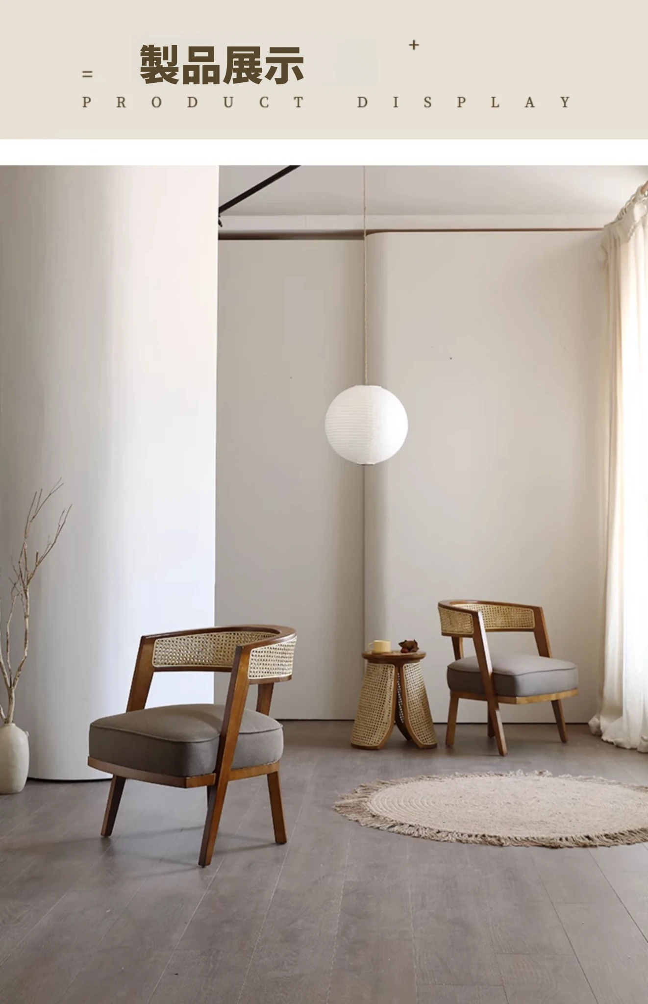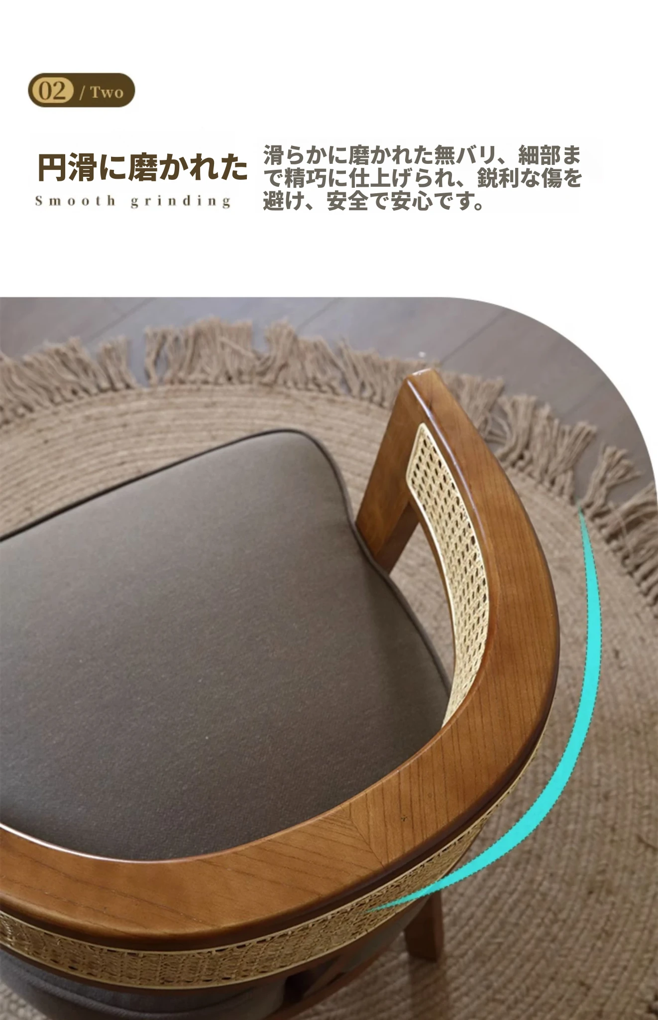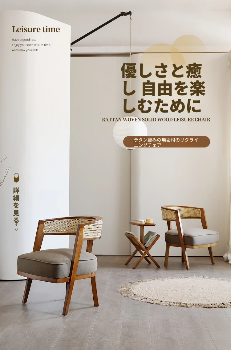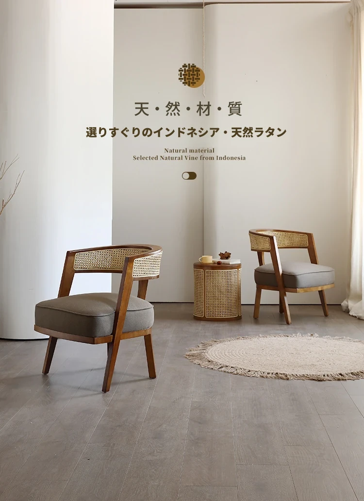 侘寂風の藤製椅子とテーブルの3点セット - 民宿やバルコニーに最適なリラックスソファー椅子、天然木と藤編みの背もたれ付き、家庭用にもぴったり!心地よいひとときをお楽しみください。