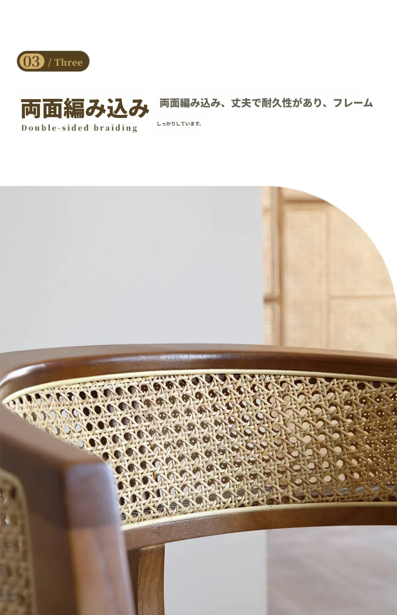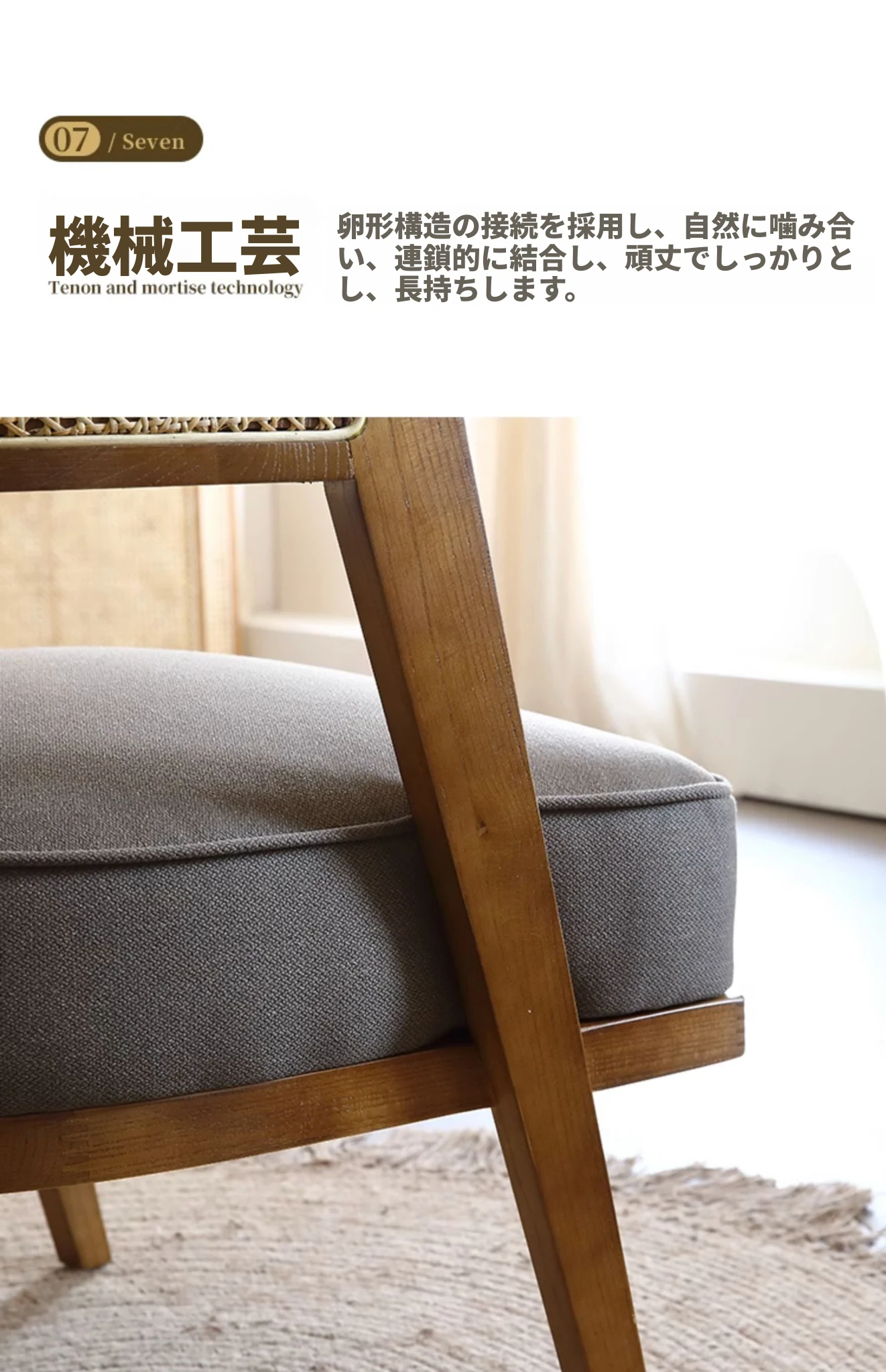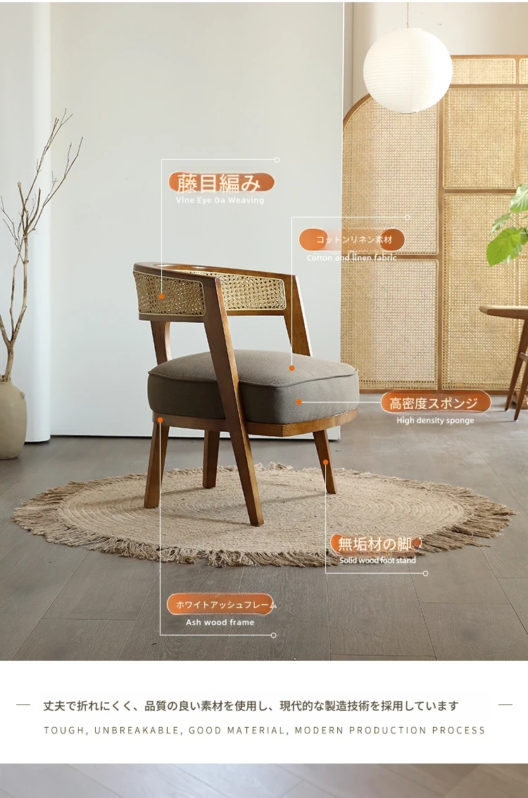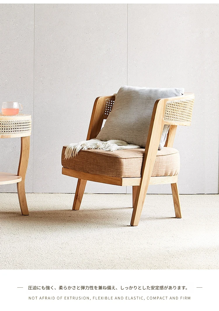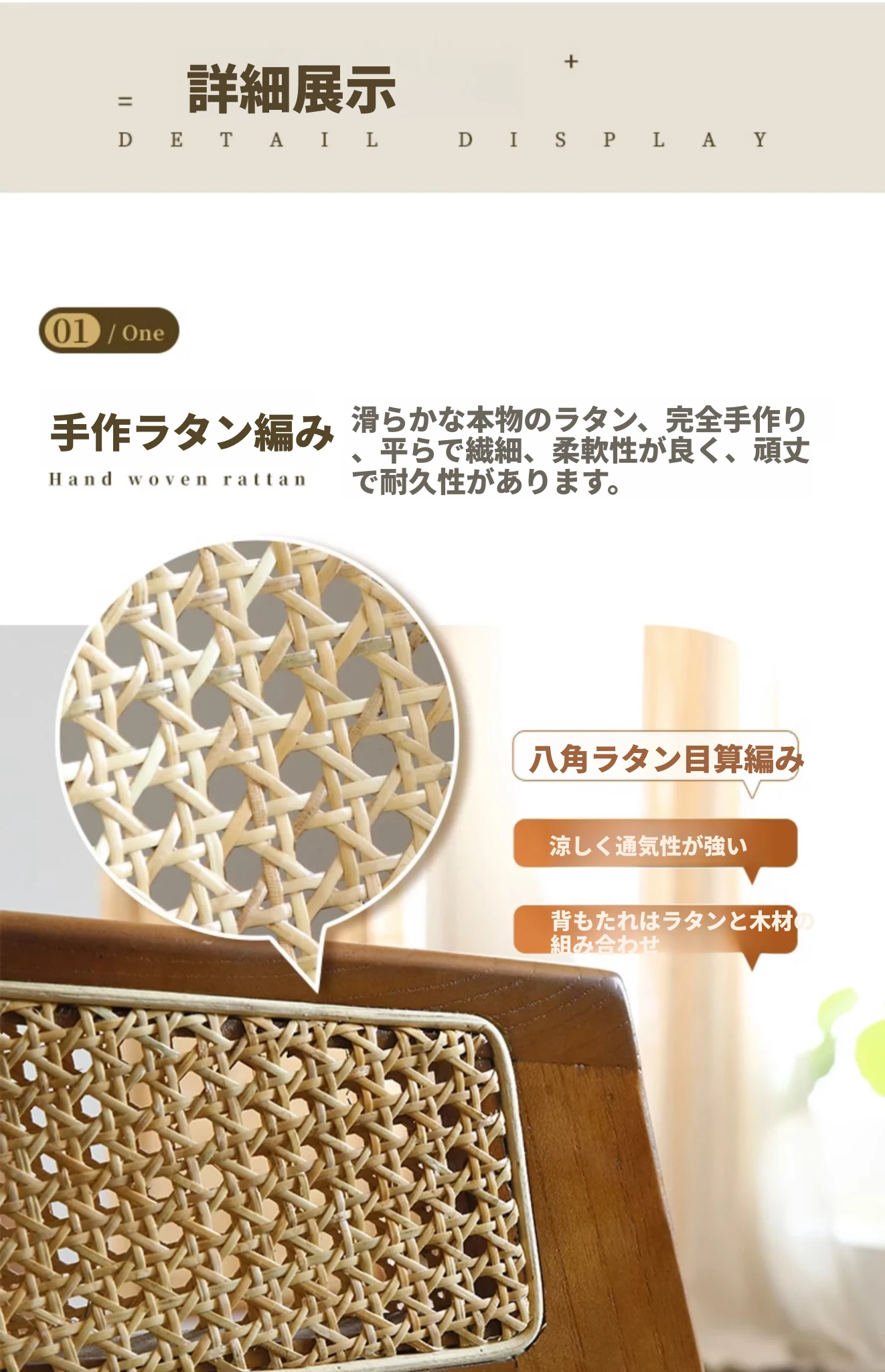 侘寂風の藤製椅子とテーブルの3点セット - 民宿やバルコニーに最適なリラックスソファー椅子、天然木と藤編みの背もたれ付き、家庭用にもぴったり!心地よいひとときをお楽しみください。