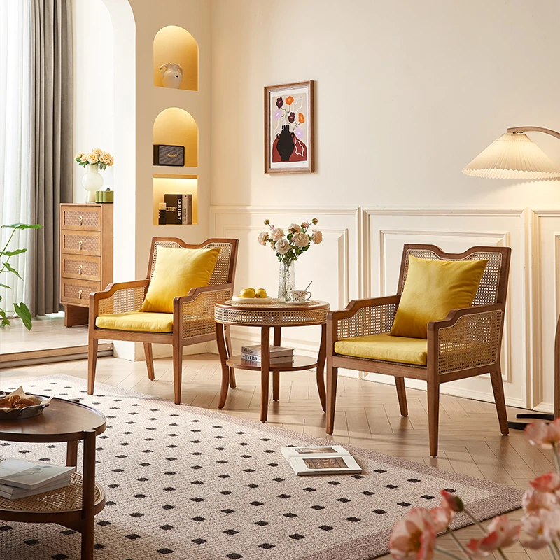 Vintage Rattan-Woven Solid Wood Lounge Chair - Cozy Home Coffee Armchair for Nordic Style B&Bs, Balconies, and Hotels - Perfect for Relaxation and Style