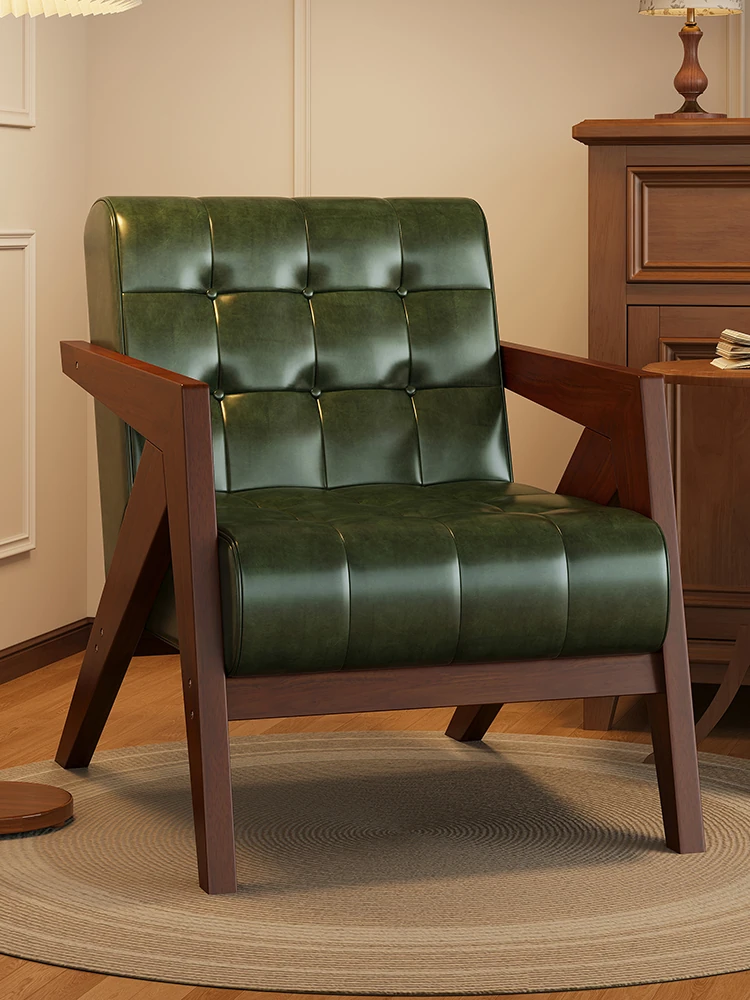 ヴィンテージ風の無垢材単人用ソファチェア「リチャード」— 民宿やホテルに最適!おしゃれなリビングやバルコニーにぴったりなデザイン、快適な談話やリラックスタイムを提供します。
